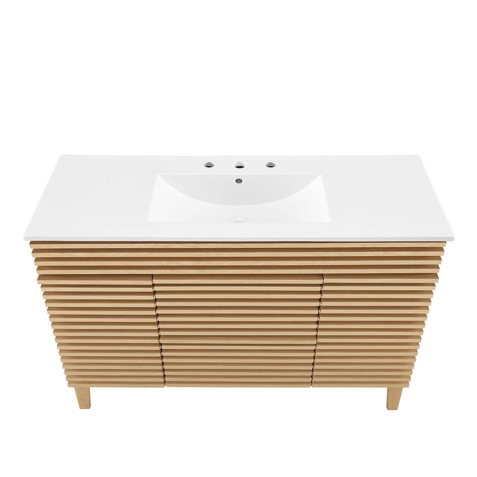 Tap into mid-century aesthetics with the Render Vanity. The Render 48" Bathroom Vanity features a durable MDF and particleboard frame with smooth walnut grain laminate, four tapered wood legs, and ample under sink storage space in full-extension drawers and behind soft-close hinged doors. Crafted with ceramic, a single sink with an integrated countertop, 8" widespread, and rectangular sink basin continue the sleek look of this retro modern vanity. Clean lines and crisp design align for an edgy style designed to meet your needs. Boasting a mid-century modern style this vanity features a solid construction with a pleasing look and practical functionality. Assembly required and fixtures not included. Set Includes: One - Render 48" Single Sink Bathroom Vanity