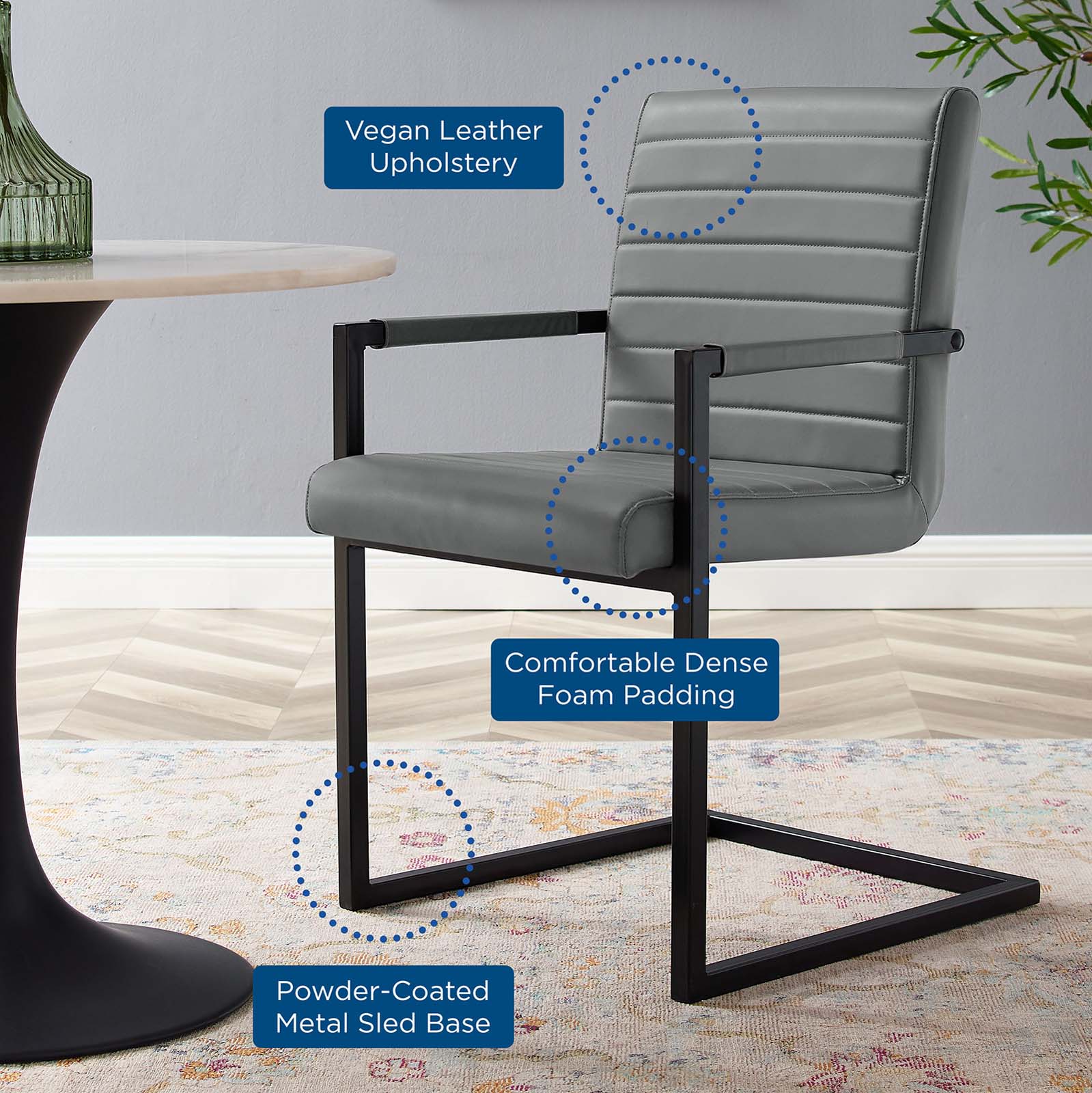 Bring contemporary intrigue and retro modern style to your dining space with the Savoy Vegan Leather Dining Chairs - Set of 2. Vegan leather upholstery makes this armchair perfect for the dining room or living space, while horizontal channel tufting brings mid-century detail. This accent chair features a sled base crafted with square tubular powder-coated metal, non-marking foot caps, and padded armrests. Dense foam padding offers a supportive seat while dining or relaxing. Chair Weight Capacity: 300 lbs. Set Includes: Two - Savoy Vegan Leather Dining Chairs