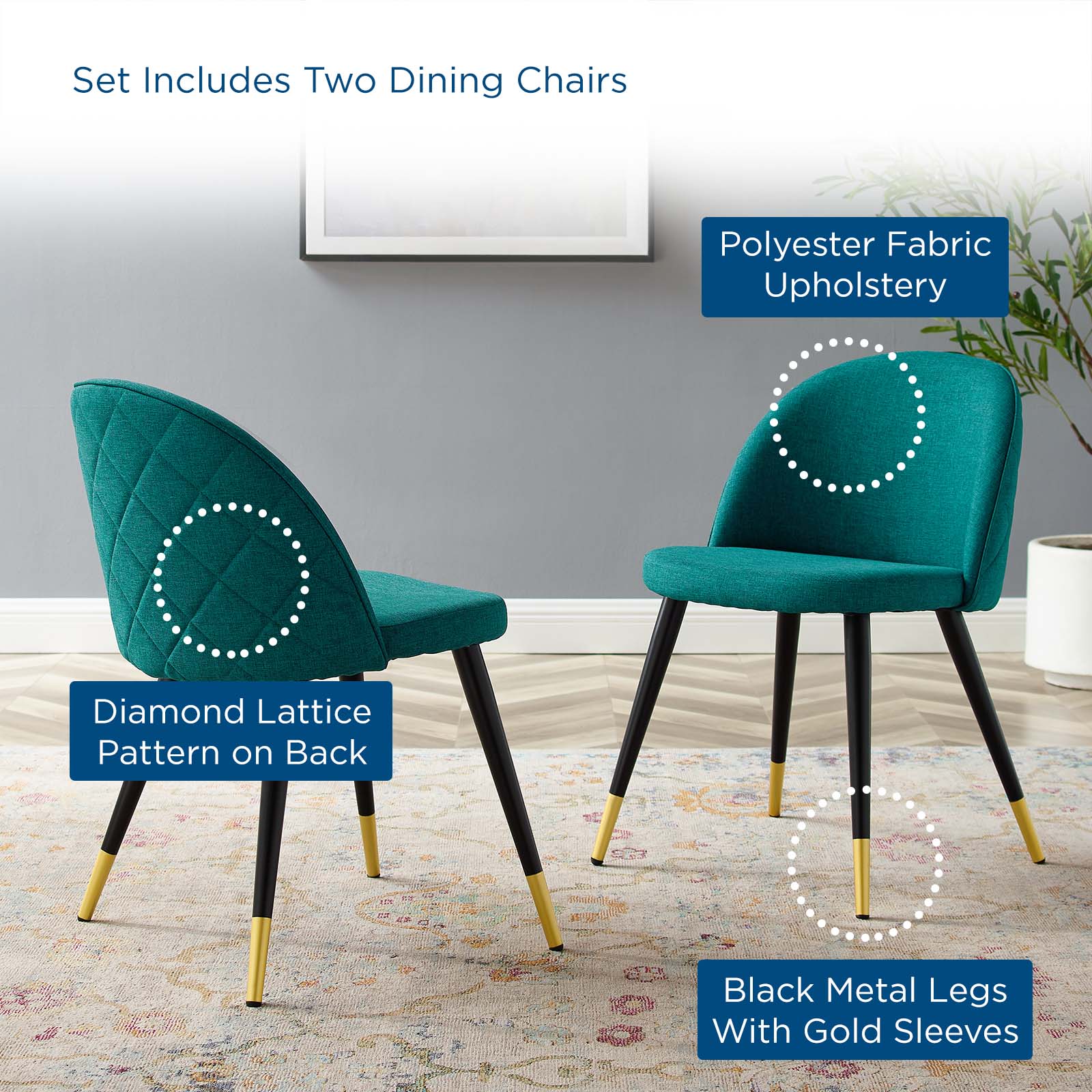 Inspire whimsical dining and stylish living with the Cordial Fabric Upholstered Dining Chairs - Set of 2. Featuring a rounded silhouette with French piping detail and a diamond lattice pattern along the back, these upholstered chairs are covered in soft polyester fabric and padded in dense foam to grant supportive comfort while dining or relaxing. A versatile addition to the dining room, kitchen, living room, home office, or entryway, these accent chairs rest atop black metal legs with gold accents and non-marking foot caps. Chair Weight Capacity: 300 lbs. Set Includes: Two - Cordial Upholstered Fabric Dining Chair