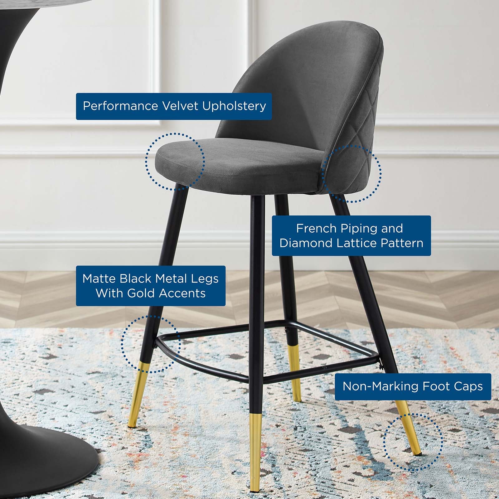 Inspire whimsical dining and functional style with the Cordial Performance Velvet Counter Stools - Set of 2. Featuring a rounded silhouette with French piping detail and a diamond lattice pattern along the back, this set of upholstered counter stools is covered in soft, stain-resistant performance velvet and padded in dense foam to grant supportive comfort while dining or relaxing. A versatile addition to a kitchen island or counter-height bar table, these velvet counter-height bar stools rest atop black metal legs with gold accents and non-marking foot caps. Counter Stool Weight Capacity: 300 lbs. Set Includes: Two - Cordial Performance Velvet Counter Stool