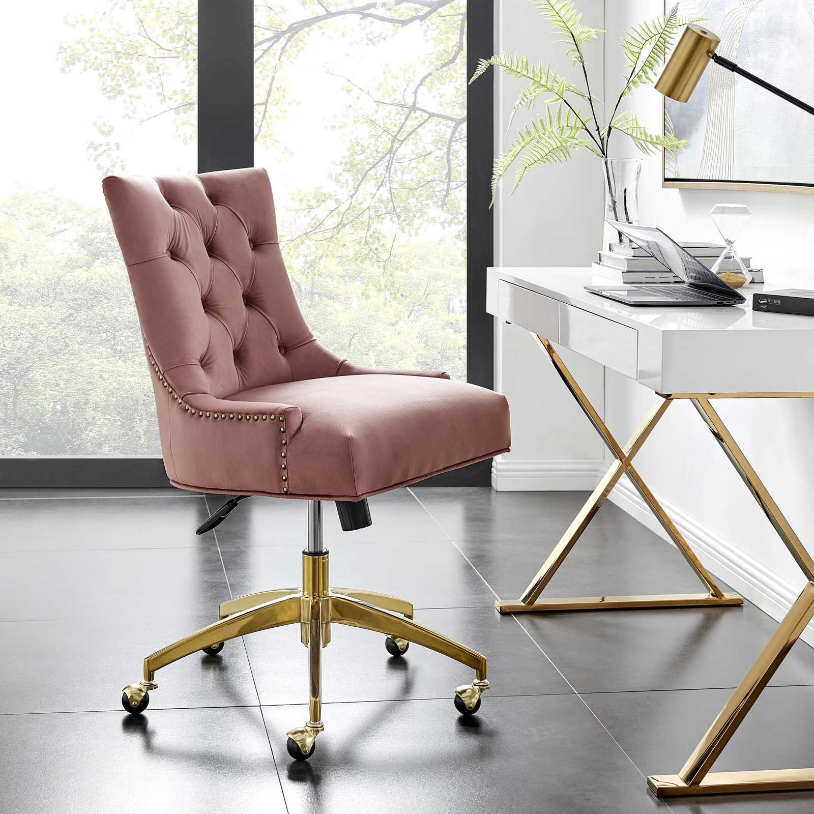 Introduce vintage flair and glam deco appeal with the Regent Tufted Performance Velvet Swivel Office Chair. Metal nailhead trim and tufted buttons provide visual depth, while a luxuriously padded upholstered stain-resistant performance velvet back and seat for exceptional support to this superbly constructed computer desk chair. A polished gold metal base and five single ball nylon casters provide easy movement over hardwood or carpeted surfaces while a full 360-degree swivel, tilt tension control, and pneumatic height adjustment create a custom seating experience for optimal performance. Perfect for the modern home or office, this velvet office chair is a desirable addition to any workspace. Chair Weight Capacity: 287 lbs. Set Includes: One - Regent Tufted Office Chair