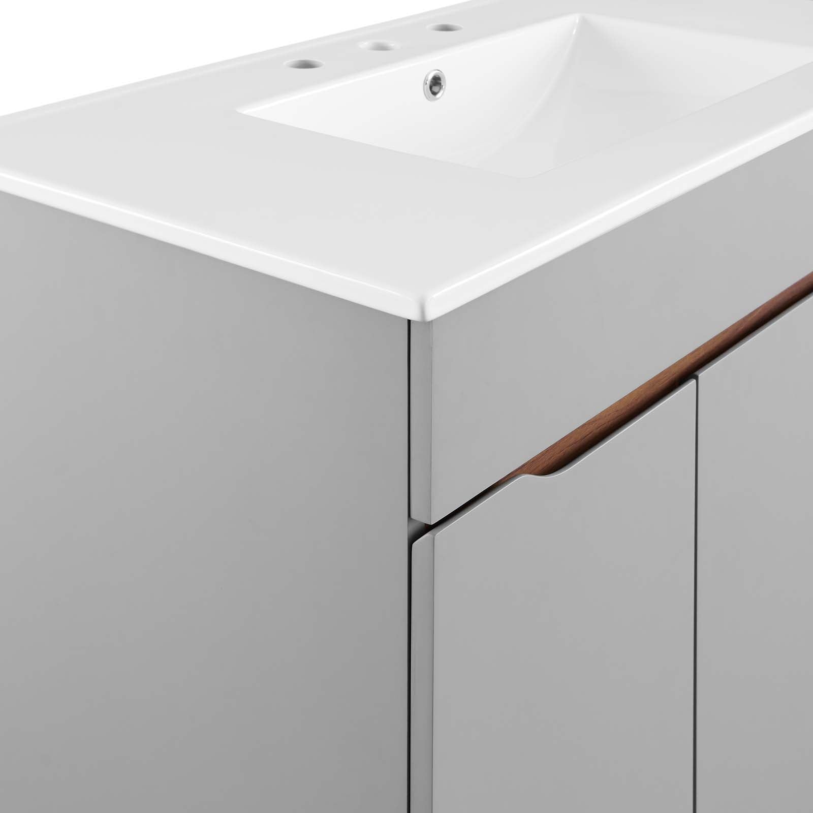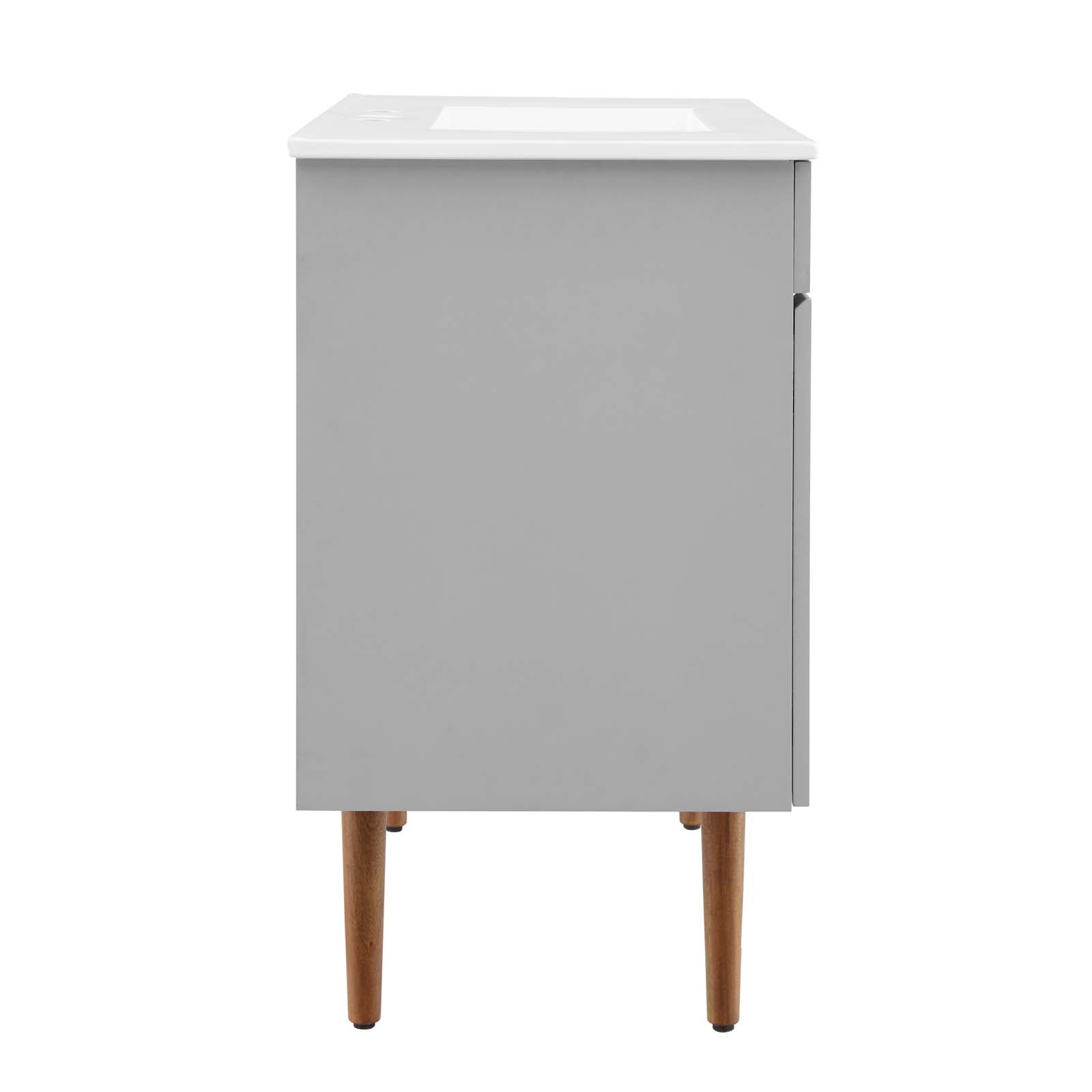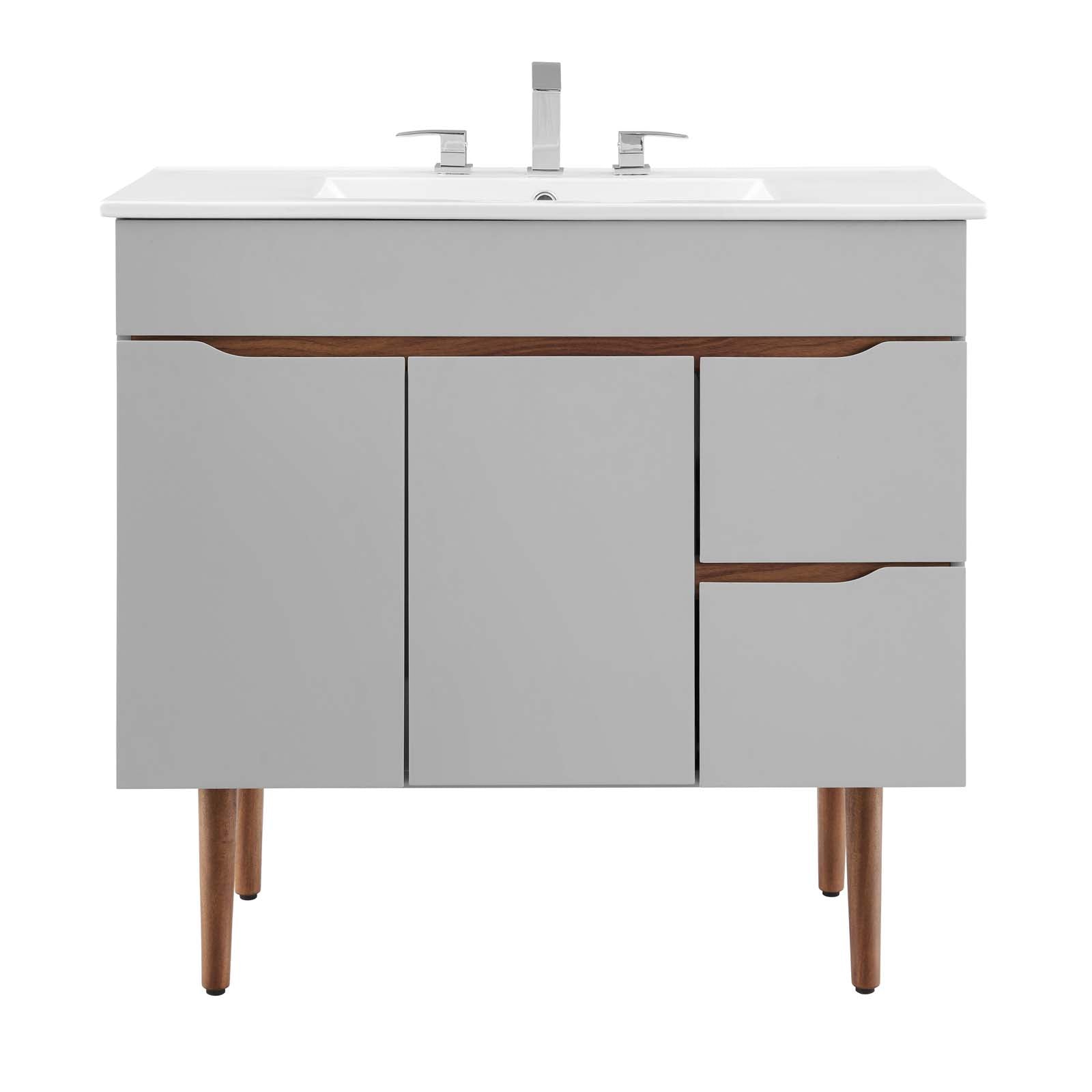 Instill the whispered elegance required to complete your bathroom decor with the Harvest 36" Mid-Century Modern Bathroom Vanity. The Harvest Bathroom Vanity features a durable MDF frame with a matte finish laminate, four tapered mahogany wood legs, two spacious drawers, and ample storage space behind two soft-close hinged doors. An integrated countertop and 8" centerset ceramic sink basin continue the sleek look with Scandinavian modern style design for a quietly bold vanity designed for a multitude of decor styles. This vanity features solid construction with a cutaway design on top of the dual doors and drawers for easy open and close functionality. Assembly required and fixtures not included. Set Includes: One - Harvest 36" Bathroom Vanity