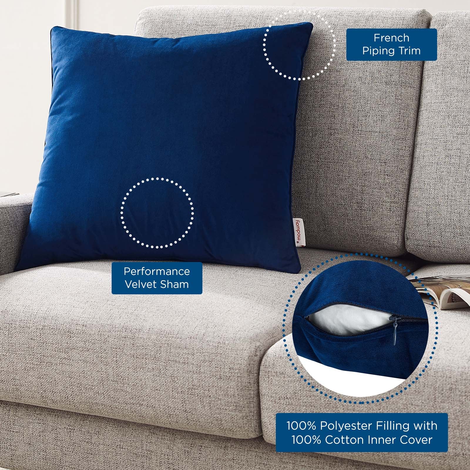 Incorporate a pop of color and texture into your home decor with the Enhance Performance Velvet Throw Pillow. With French piping along the edges, this accent pillow is perfect for a sofa, loveseat, armchair, bench, or bed. Bringing rich textiles to your living space or bedroom, this accent pillow wears a beautiful performance velvet sham that's soft to the touch. The insert of this square pillow is stuffed with plush polyester filling and complete with a 100% cotton inner cover. Set Includes: One - Enhance 20" Throw Pillow