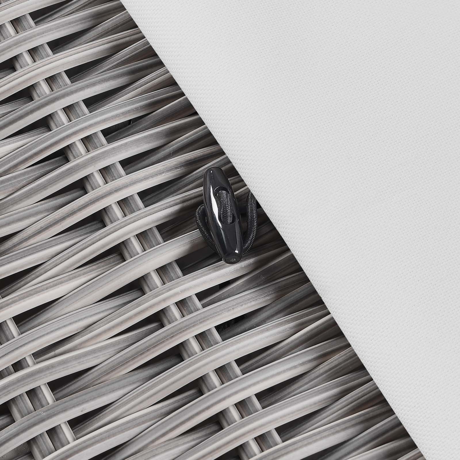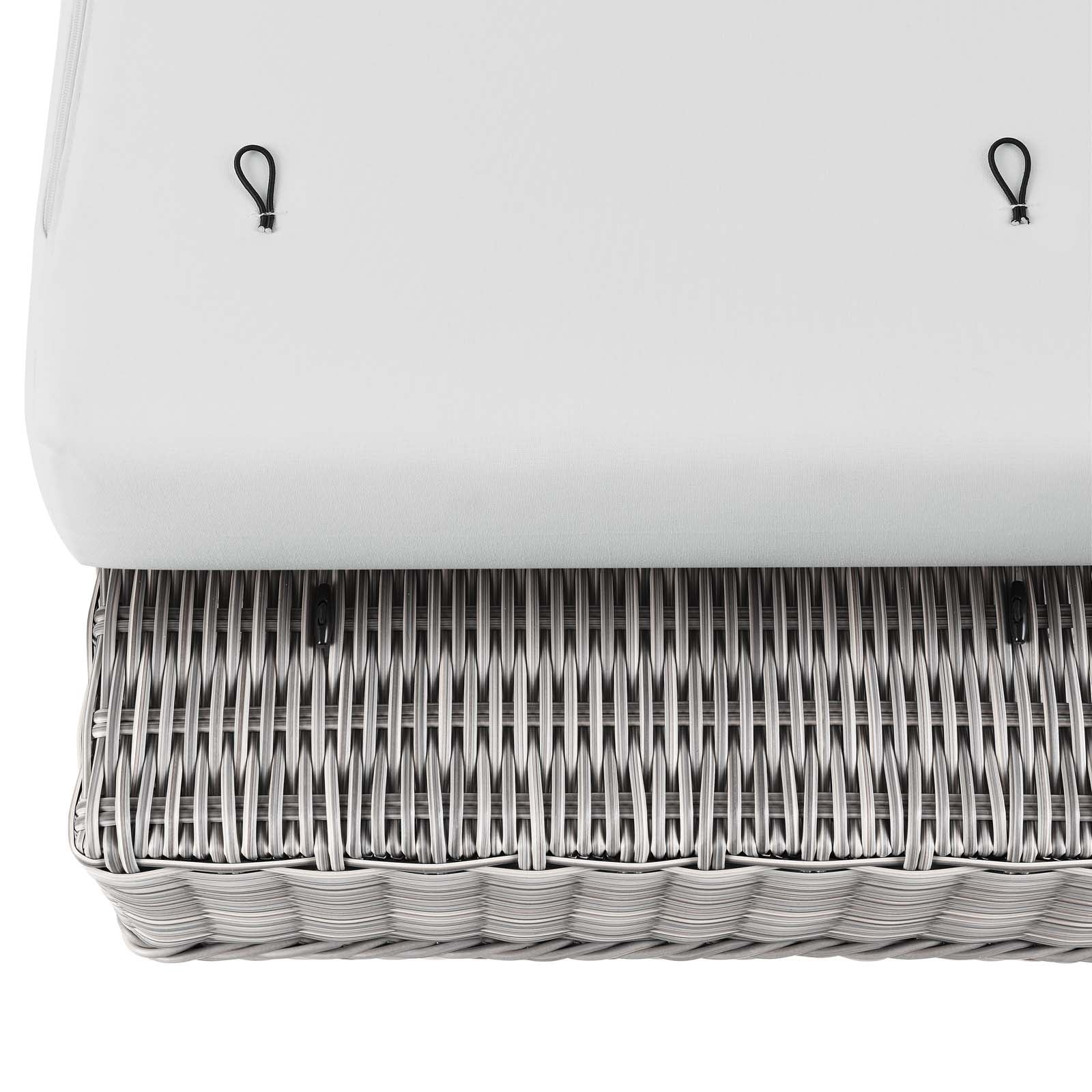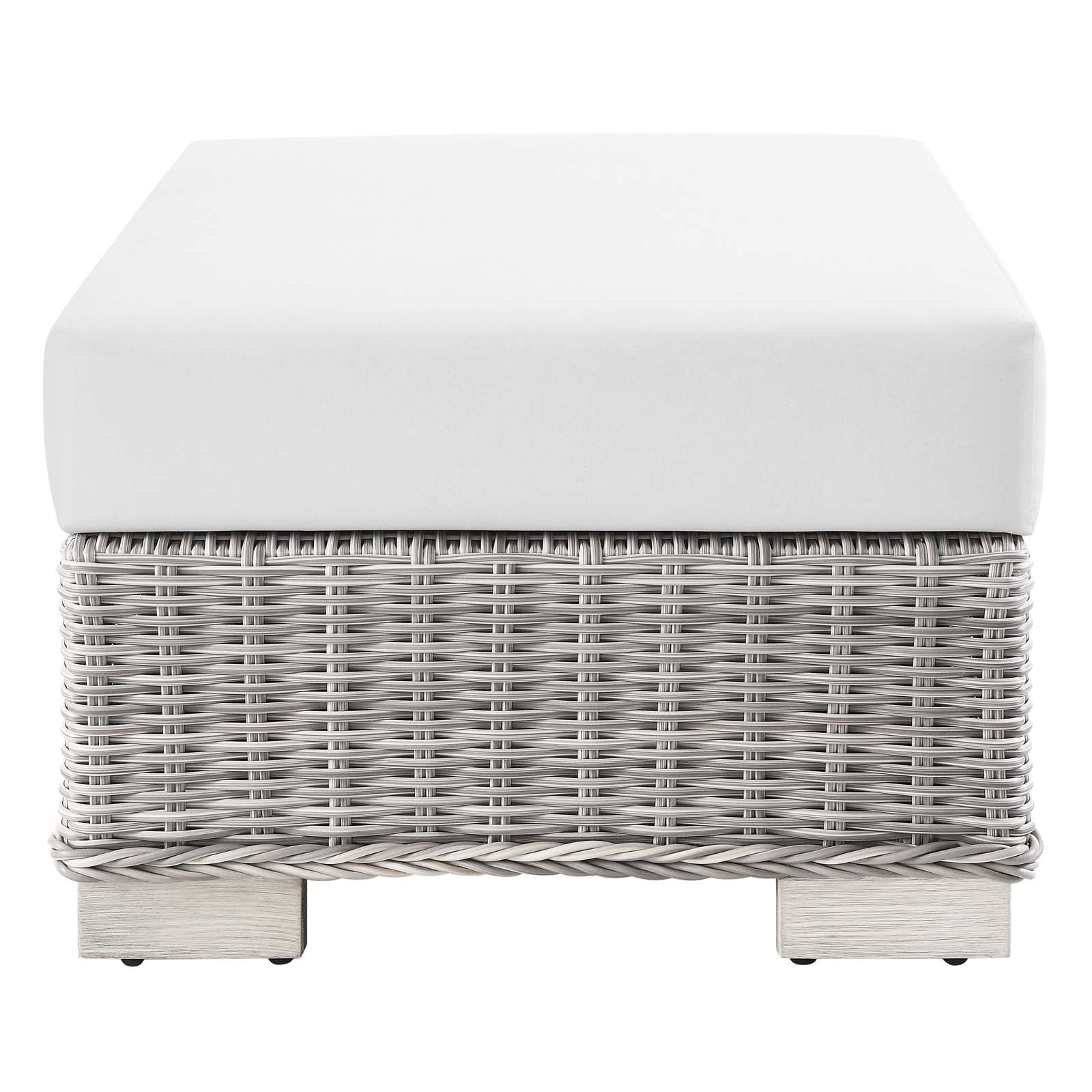 Enjoy fresh air and alfresco relaxation with the Conway Outdoor Patio Wicker Rattan Ottoman. Wrapped in UV-resistant light gray synthetic wicker rattan, this patio ottoman boasts organic texture and a neutral hue that brings a calming presence to your outdoor space. The frame of this outdoor ottoman is crafted with durable powder-coated aluminum and rests on L-shaped legs with plastic foot glides. A thick foam padded cushion covered with a removable, water-resistant polyester cover offers a comfortable seat and affixes securely to the ottoman with a cord tension attachment. Trending aesthetics and a classic design define this outdoor patio furniture collection making it a beautiful addition to any outdoor space including the backyard, patio, porch, balcony, or poolside. Assembly required. Patio Ottoman Weight Capacity: 300 lbs. Set Includes: One - Conway Ottoman