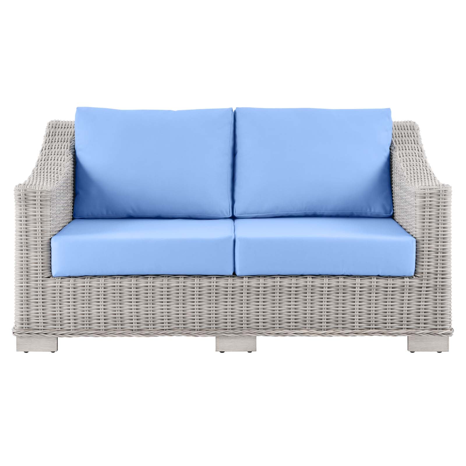 Enjoy fresh air and alfresco relaxation with the Conway Outdoor Patio Wicker Rattan Loveseat. Wrapped in UV-resistant light gray synthetic wicker rattan, this patio loveseat boasts organic texture and a neutral hue that brings a calming presence to your outdoor space. The frame of this outdoor two-seater sofa is crafted with durable powder-coated aluminum and rests on L-shaped legs with plastic foot glides. Thick foam padded cushions covered with removable, water-resistant polyester covers offer a comfortable seat and affix securely to the loveseat with cord tension attachments. Trending aesthetics and a classic design define this outdoor patio furniture collection making it a beautiful addition to any outdoor space including the backyard, patio, porch, balcony, or poolside. Assembly required. Patio Loveseat Weight Capacity: 600 lbs. Set Includes: One - Conway Loveseat