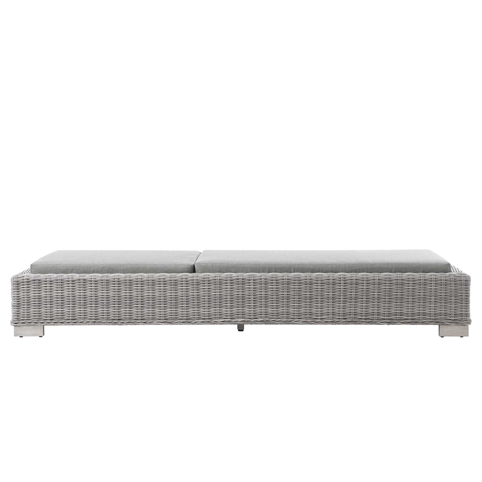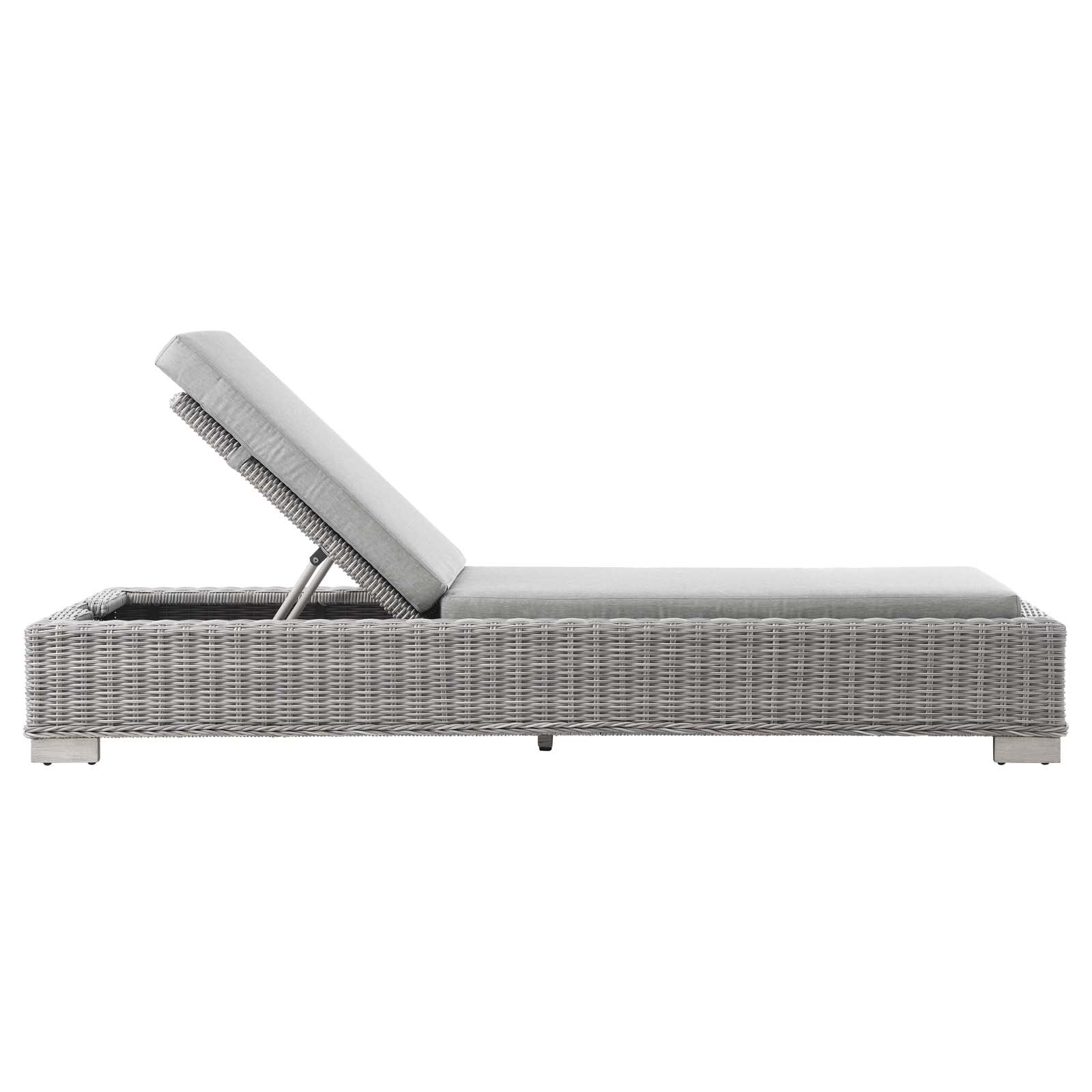 Enjoy fresh air and alfresco relaxation with the Conway Outdoor Patio Wicker Rattan Chaise Lounge Chair. Wrapped in UV-resistant light gray synthetic wicker rattan, this lounge chair boasts organic texture and a neutral hue that brings a calming presence to your outdoor space. With four different reclining positions, the frame of this outdoor chaise lounge is crafted with durable powder-coated aluminum and rests on L-shaped legs with plastic foot glides. Thick foam padded cushions covered with removable, water-resistant polyester covers offer a comfortable seat and affix securely to the lounge chair with cord tension attachments. Trending aesthetics and a classic design define this outdoor patio furniture collection making it a beautiful addition to any outdoor space including the backyard, patio, porch, balcony, or poolside. Assembly required. Chaise Lounge Weight Capacity: 600 lbs. Set Includes: One - Conway Chaise Lounge