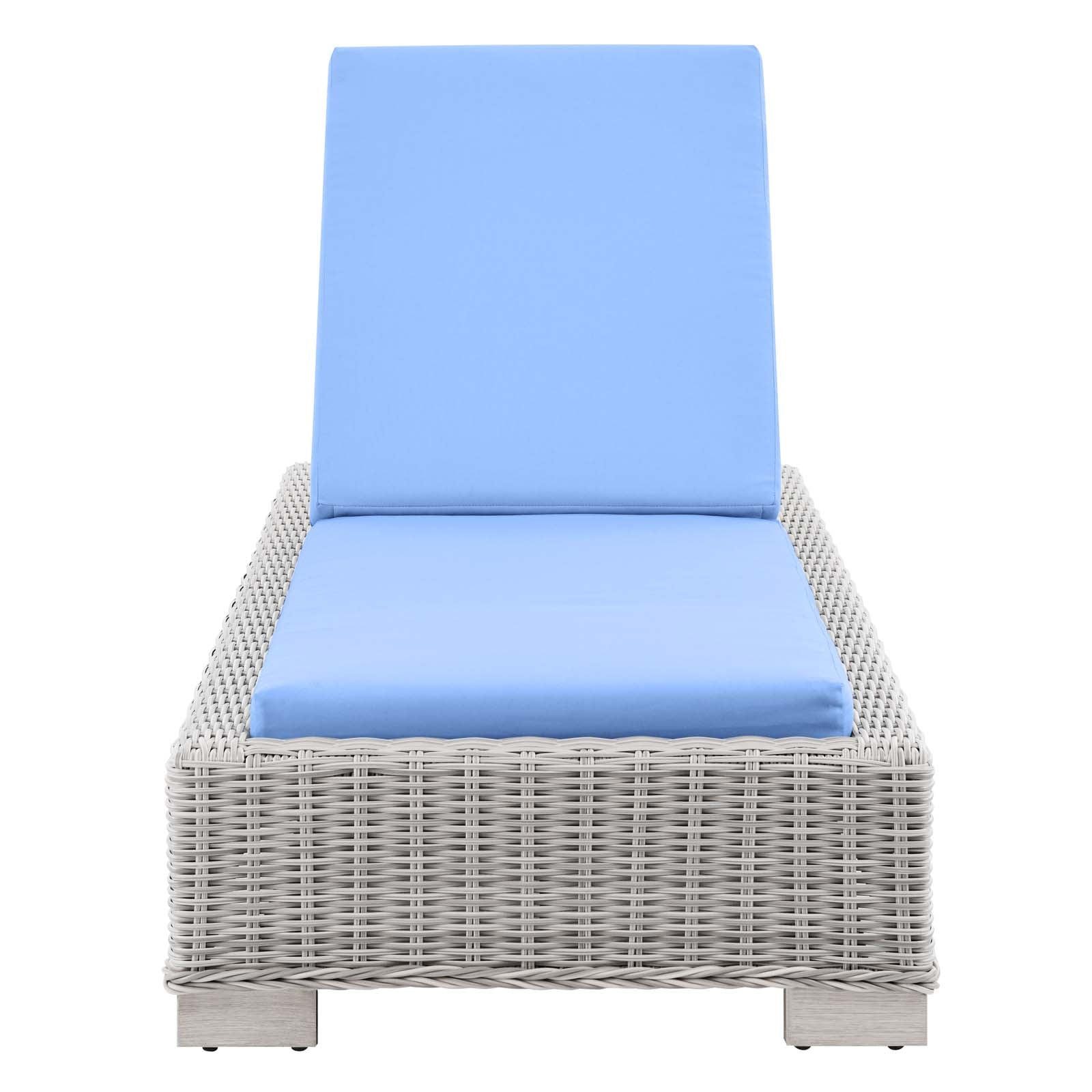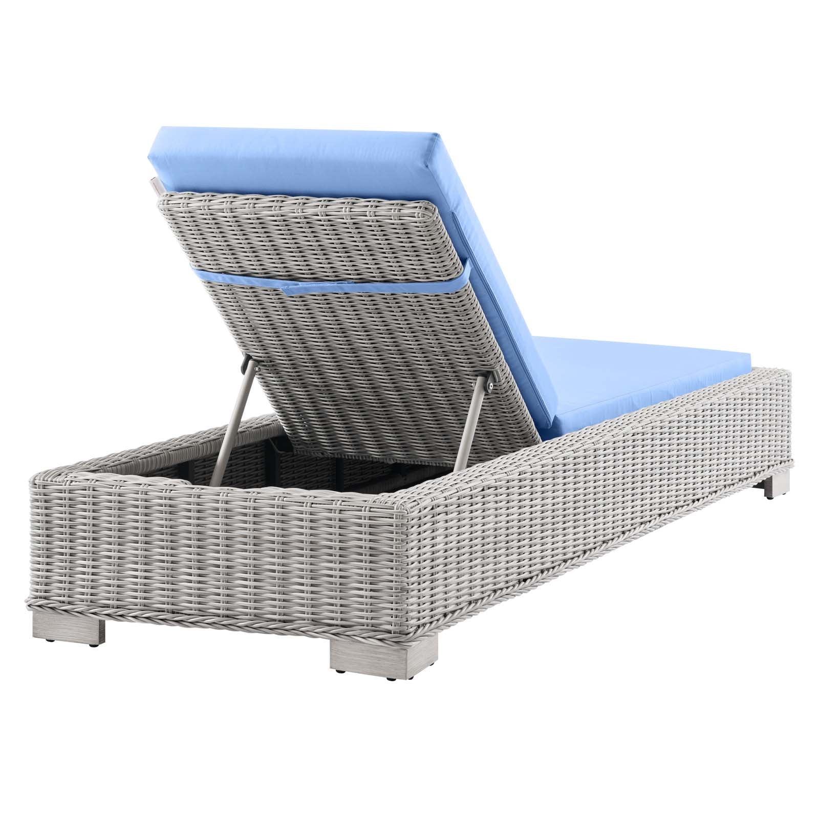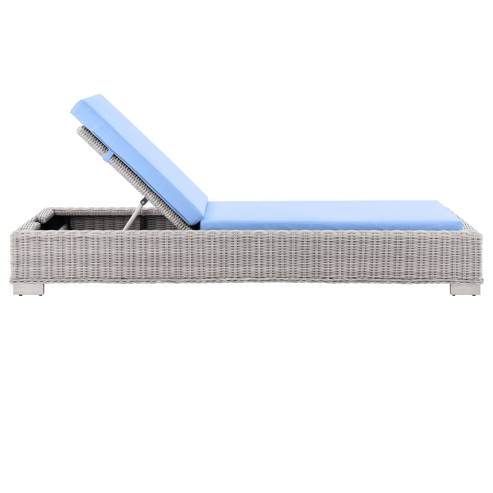 Enjoy fresh air and alfresco relaxation with the Conway Outdoor Patio Wicker Rattan Chaise Lounge Chair. Wrapped in UV-resistant light gray synthetic wicker rattan, this lounge chair boasts organic texture and a neutral hue that brings a calming presence to your outdoor space. With four different reclining positions, the frame of this outdoor chaise lounge is crafted with durable powder-coated aluminum and rests on L-shaped legs with plastic foot glides. Thick foam padded cushions covered with removable, water-resistant polyester covers offer a comfortable seat and affix securely to the lounge chair with cord tension attachments. Trending aesthetics and a classic design define this outdoor patio furniture collection making it a beautiful addition to any outdoor space including the backyard, patio, porch, balcony, or poolside. Assembly required. Chaise Lounge Weight Capacity: 600 lbs. Set Includes: One - Conway Chaise Lounge