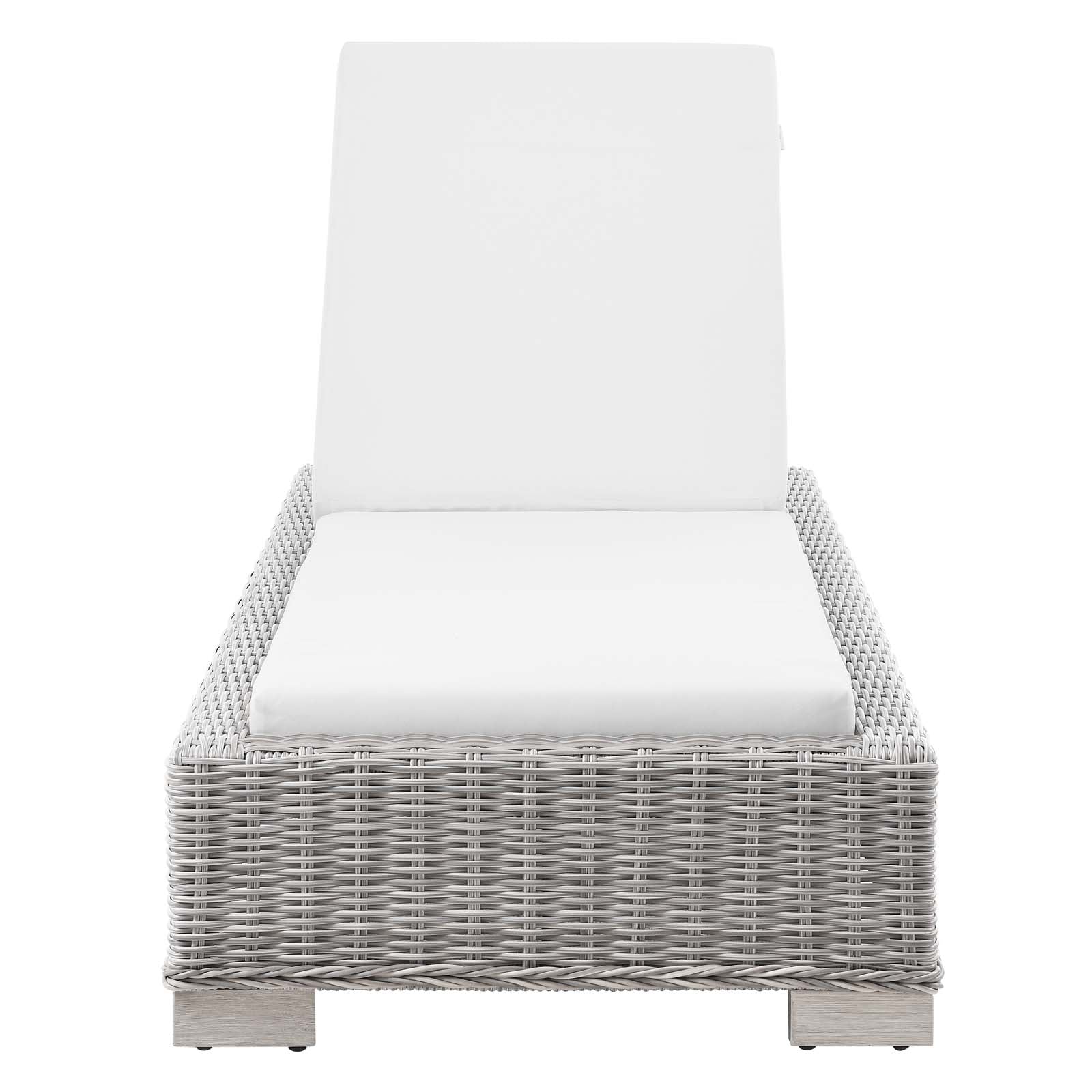 Enjoy fresh air and alfresco relaxation with the Conway Outdoor Patio Wicker Rattan Chaise Lounge Chair. Wrapped in UV-resistant light gray synthetic wicker rattan, this lounge chair boasts organic texture and a neutral hue that brings a calming presence to your outdoor space. With four different reclining positions, the frame of this outdoor chaise lounge is crafted with durable powder-coated aluminum and rests on L-shaped legs with plastic foot glides. Thick foam padded cushions covered with removable, water-resistant polyester covers offer a comfortable seat and affix securely to the lounge chair with cord tension attachments. Trending aesthetics and a classic design define this outdoor patio furniture collection making it a beautiful addition to any outdoor space including the backyard, patio, porch, balcony, or poolside. Assembly required. Chaise Lounge Weight Capacity: 600 lbs. Set Includes: One - Conway Chaise Lounge