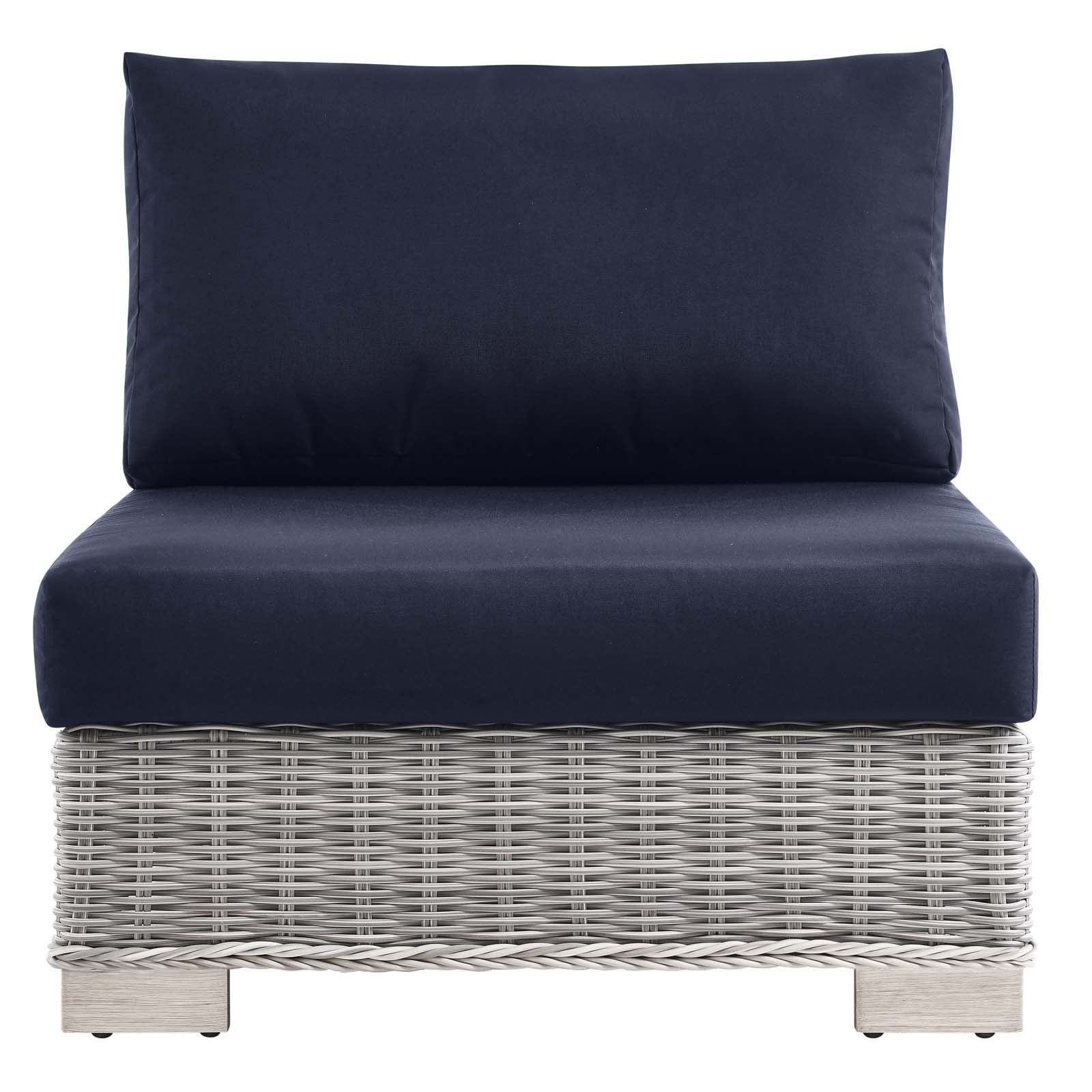 Enjoy fresh air and alfresco relaxation with the Conway Outdoor Patio Wicker Rattan Armless Chair. Wrapped in UV-resistant light gray synthetic wicker rattan, this patio chair boasts organic texture and a neutral hue that brings a calming presence to your outdoor space. The frame of this outdoor armless chair is crafted with durable powder-coated aluminum and rests on L-shaped legs with plastic foot glides. Thick foam padded cushions covered with removable, water-resistant polyester covers offer a comfortable seat and affix securely to the lounge chair with cord tension attachments. Trending aesthetics and a classic design define this outdoor patio furniture collection making it a beautiful addition to any outdoor space including the backyard, patio, porch, balcony, or poolside. Assembly required. Patio Armless Chair Weight Capacity: 300 lbs. Set Includes: One - Conway Armless Chair