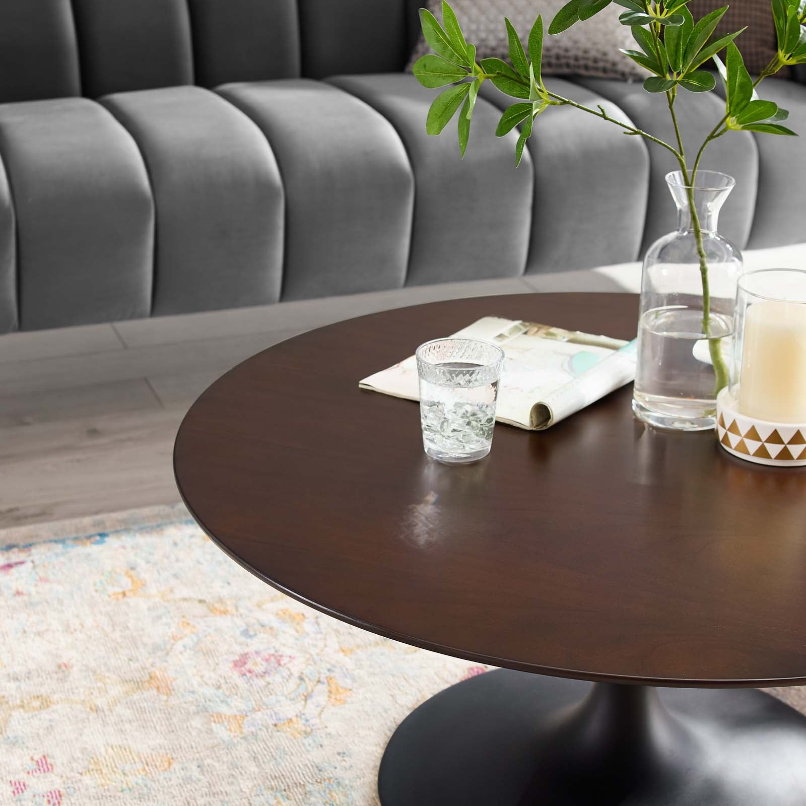 Reflecting a seamless organic shape and timeless form, the Lippa Table has become a symbol of modernism for over the past 60 years. Before its release, homes were filled with clunky remnants of an industrial age long gone by. But in order to advance into the new world, homes first had to transition from the traditional square table, into a piece that connoted progress. The base and dimensions are true to the original specifications, while the table’s circular MDF top has an easy-to-clean wood grain veneer and the metal tapered base features a black powder-coated finish. Set Includes: One - Lippa 36" Coffee Table