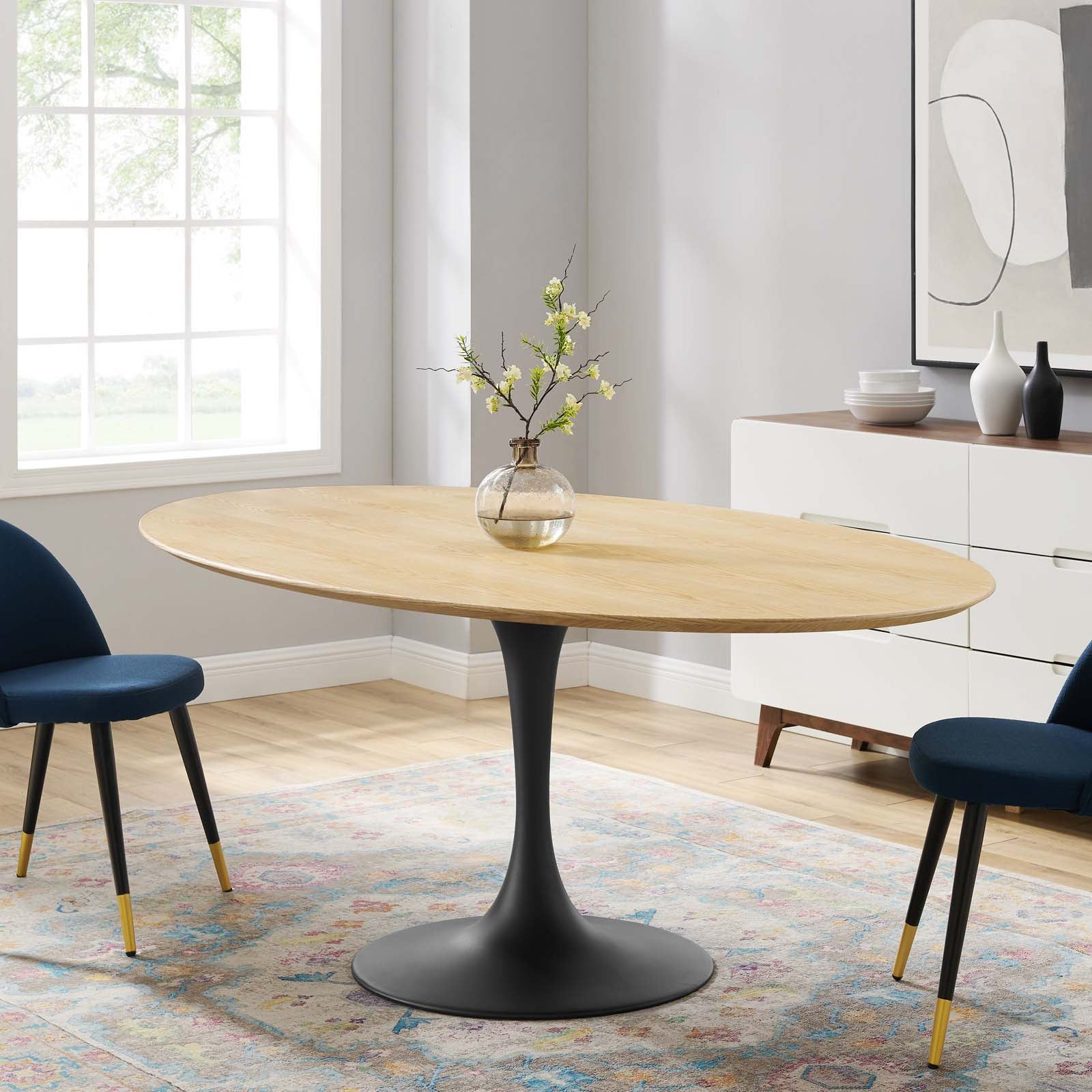 Reflecting a seamless organic shape and timeless form, the Lippa dining table has become a symbol of modernism for over the past 60 years. Before its release, homes were filled with clunky remnants of an industrial age long gone by. But in order to advance into the new world, homes first had to transition from the traditional oval table, into a piece that connoted progress. The base and dimensions are true to the original specifications, while the table’s oval MDF top has an easy-to-clean wood grain veneer, and the metal tapered base features a black powder-coated finish. Set Includes: One - Lippa 78" Oval Dining Table