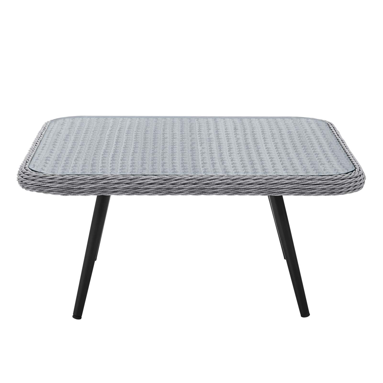 Gather family and friends to indulge in good weather and a premium lounge experience with the Endeavor Outdoor Patio Collection. Sporting a stylish contemporary modern look, Endeavor features waterproof, black powder-coated aluminum legs, non-marking foot caps, and a designer gray-on-gray tone synthetic rattan weave perfect for upgrading a variety of balcony, garden, backyard, and patio decors. The spacious profile of this sectional sofa and all-weather cushions offer long-lasting comfort when relaxing or entertaining. This outdoor set is complete with an easy-to-clean tempered glass top providing the ideal surface for resting a plate of hors d’oeuvres, a cocktail or current read. Sectional Sofa Weight Capacity: 330 lbs. Set Includes: One - Endeavor Wicker Rattan Sectional Sofa One - Endeavor Wicker Rattan Square Coffee Table