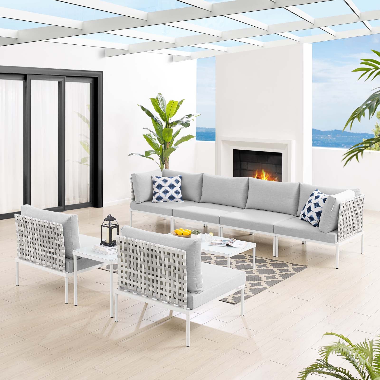 Engage life with Harmony. Enjoy casual conversation under the open sky with an all-weather waterproof furniture set that delivers an exceptional outdoor porch, patio, balcony or garden experience. An exceptional modern furniture set that exceeds expectations, Harmony comes with long-lasting machine washable Sunbrella® cushions, synthetic rattan seat back weave, square powder coated aluminum bases, tempered glass top tables, and non-marking foot caps. A sectional that arranges according to the spontaneous needs of your guests, set your sights on open and inspired moments with the Harmony Outdoor Patio Collection. Set Includes: 4 Armless Chairs, 2 Corner Chairs, 1 Coffee Table, 1 Side Table Set Includes: Four - Harmony Armless Chair One - Harmony Coffee Table One - Harmony Side Table Table Two - Harmony Corner Chair
