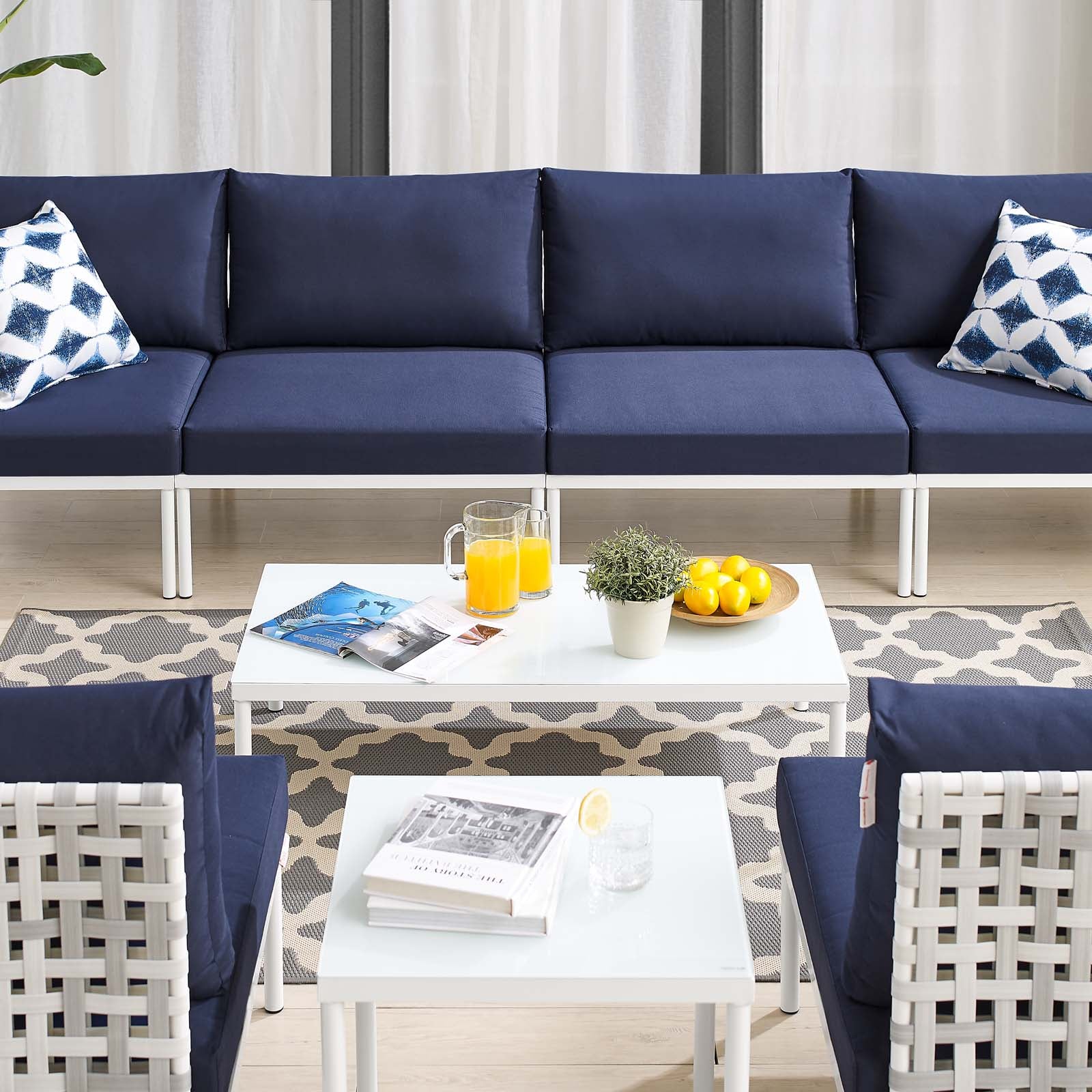 Engage life with Harmony. Enjoy casual conversation under the open sky with an all-weather waterproof furniture set that delivers an exceptional outdoor porch, patio, balcony or garden experience. An exceptional modern furniture set that exceeds expectations, Harmony comes with long-lasting machine washable Sunbrella® cushions, synthetic rattan seat back weave, square powder coated aluminum bases, tempered glass top tables, and non-marking foot caps. A sectional that arranges according to the spontaneous needs of your guests, set your sights on open and inspired moments with the Harmony Outdoor Patio Collection. Set Includes: 4 Armless Chairs, 2 Corner Chairs, 1 Coffee Table, 1 Side Table Set Includes: Four - Harmony Armless Chair One - Harmony Coffee Table One - Harmony Side Table Table Two - Harmony Corner Chair