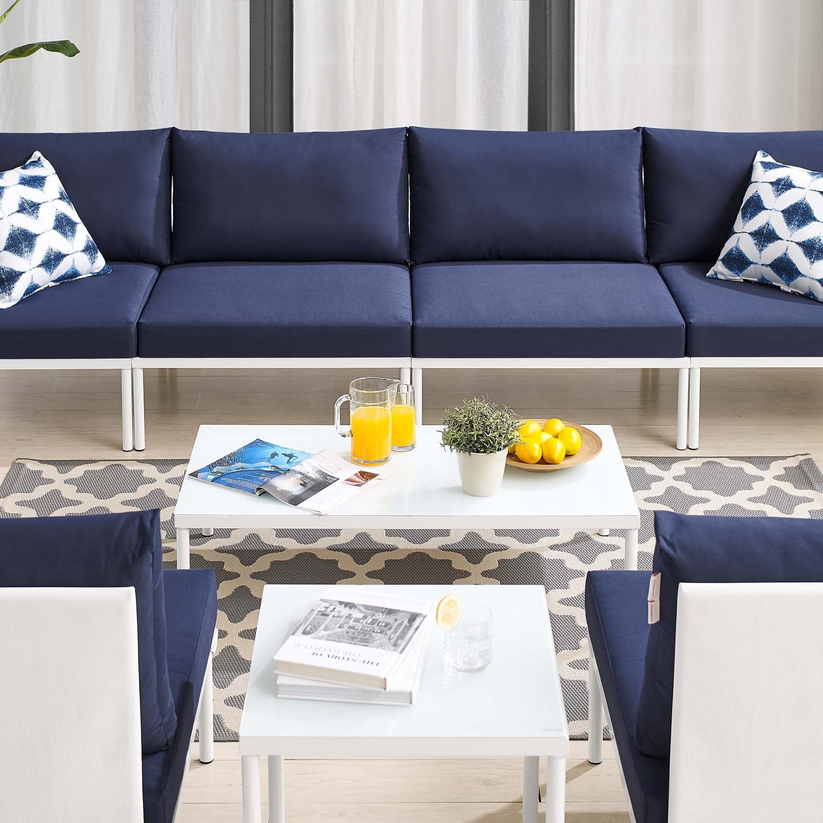 Engage life with Harmony. Enjoy casual conversation under the open sky with an all-weather waterproof furniture set that delivers an exceptional outdoor porch, patio, balcony or garden experience. An exceptional modern furniture set that exceeds expectations, Harmony comes with long-lasting machine washable Sunbrella® cushions, soft and durable polyester Textiline® panels, square powder coated aluminum bases, tempered glass top tables, and non-marking foot caps. A sectional that arranges according to the spontaneous needs of your guests, set your sights on open and inspired moments with the Harmony Outdoor Patio Collection. Set Includes: 4 Armless Chairs, 2 Corner Chairs, 1 Coffee Table, 1 Side Table Set Includes: Four - Harmony Armless Chair One - Harmony Coffee Table One - Harmony Side Table Table Two - Harmony Corner Chair