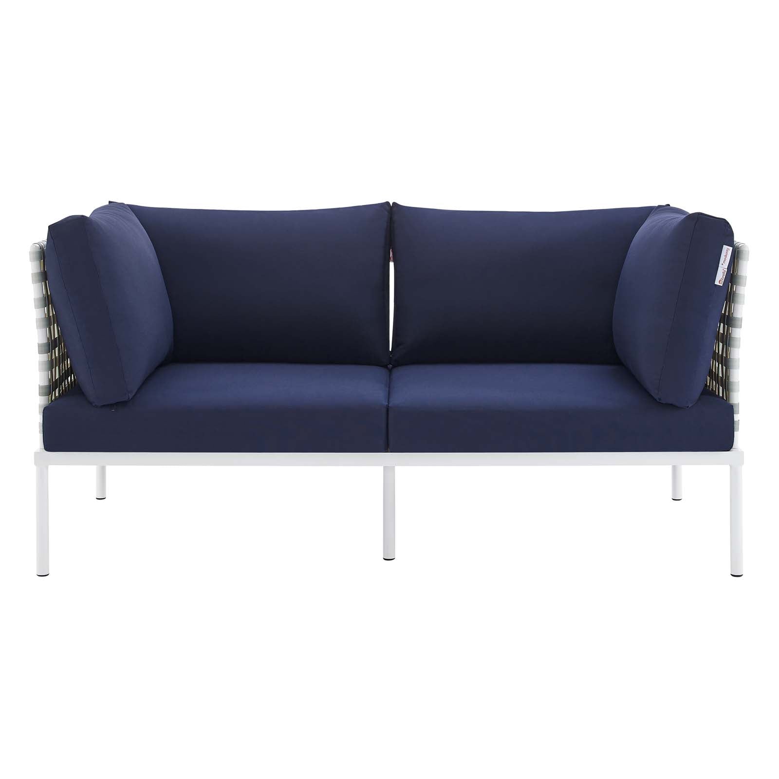 Engage life with Harmony Outdoor Patio Loveseat. Enjoy casual conversation under the open sky with an all-weather waterproof outdoor loveseat from a versatile furniture set that delivers an exceptional outdoor porch, patio, balcony or garden experience. An exceptional modern outdoor furniture set that exceeds expectations, Harmony Patio Two-Seat Sofa comes with synthetic rattan seat back weave, square powder coated aluminum bases, Sunbrella® cushions, and non-marking foot caps. An outside loveseat that arranges according to the spontaneous needs of your guests, set your sights on open and inspired moments with the Harmony Outdoor Patio Collection. Set Includes: One - Harmony Basket Weave Loveseat