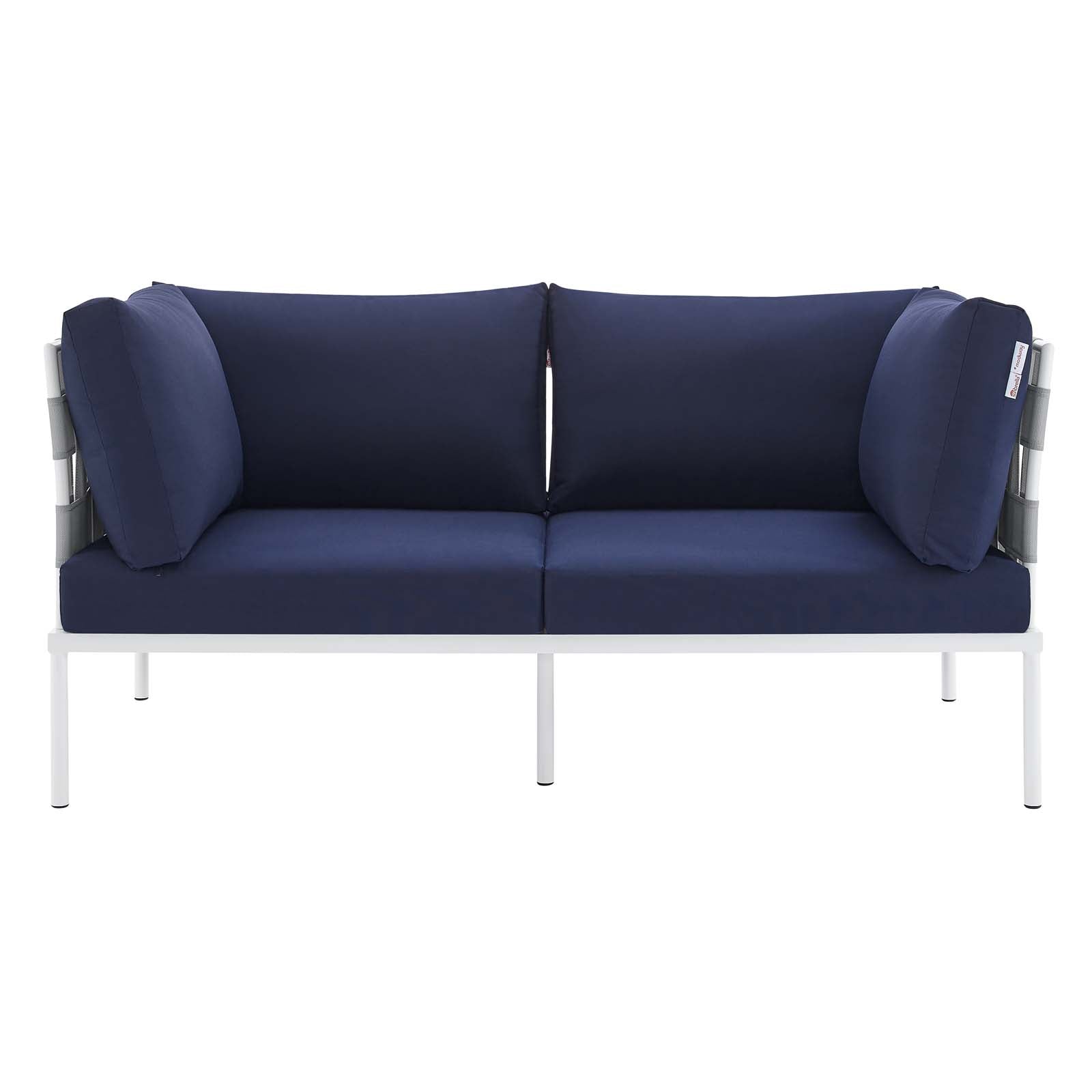 Engage life with Harmony Outdoor Patio Loveseat. Enjoy casual conversation under the open sky with an all-weather waterproof outdoor loveseat from a versatile furniture set that delivers an exceptional outdoor porch, patio, balcony or garden experience. An exceptional modern outdoor furniture set that exceeds expectations, Harmony Patio Two-Seat Sofa comes with silk polyester seat back weave, square powder coated aluminum bases, Sunbrella® cushions, and non-marking foot caps. An outside loveseat that arranges according to the spontaneous needs of your guests, set your sights on open and inspired moments with the Harmony Outdoor Patio Collection. Set Includes: One - Harmony Loveseat