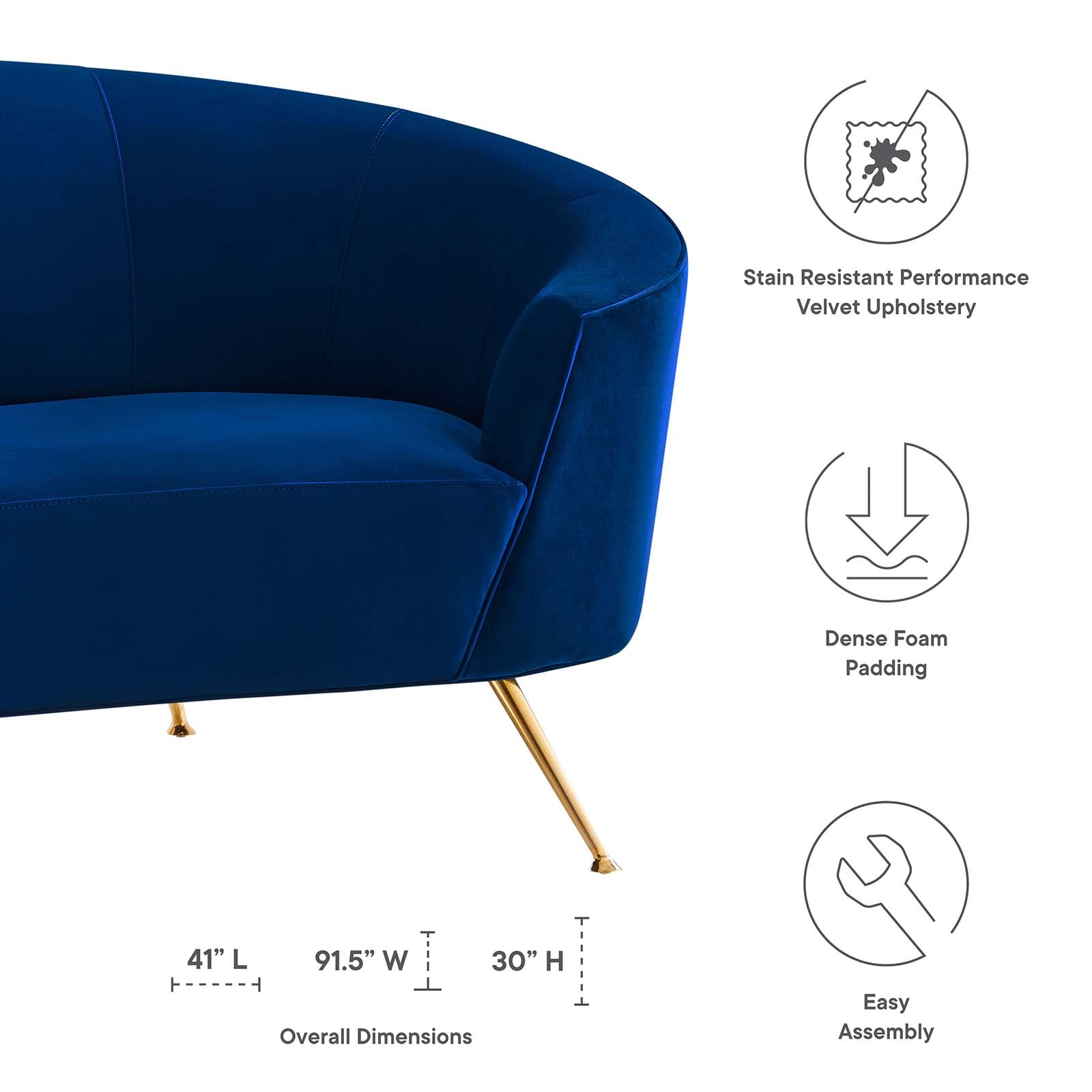 Elevate your living room style with the sophisticated aesthetic of the Marchesa Performance Velvet Sofa. Solidly constructed with a durable webbed support system, this retro-modern sofa enlivens your living room or lounge area. Carried with panache on splayed gold stainless steel legs, this expansively curved sofa is the picture of elegance in mid-century modern, contemporary or eclectic settings. The Marchesa Performance Velvet Sofa is sure to become a compelling family room favorite with dense foam padding and stain-resistant performance velvet upholstery. This sturdy couch is a gracious addition to the bedroom or home office. Marchesa is outfitted with non-marking foot glides to protect your floors. Sofa Weight Capacity: 993 lbs. Set Includes: One - Marchesa Sofa