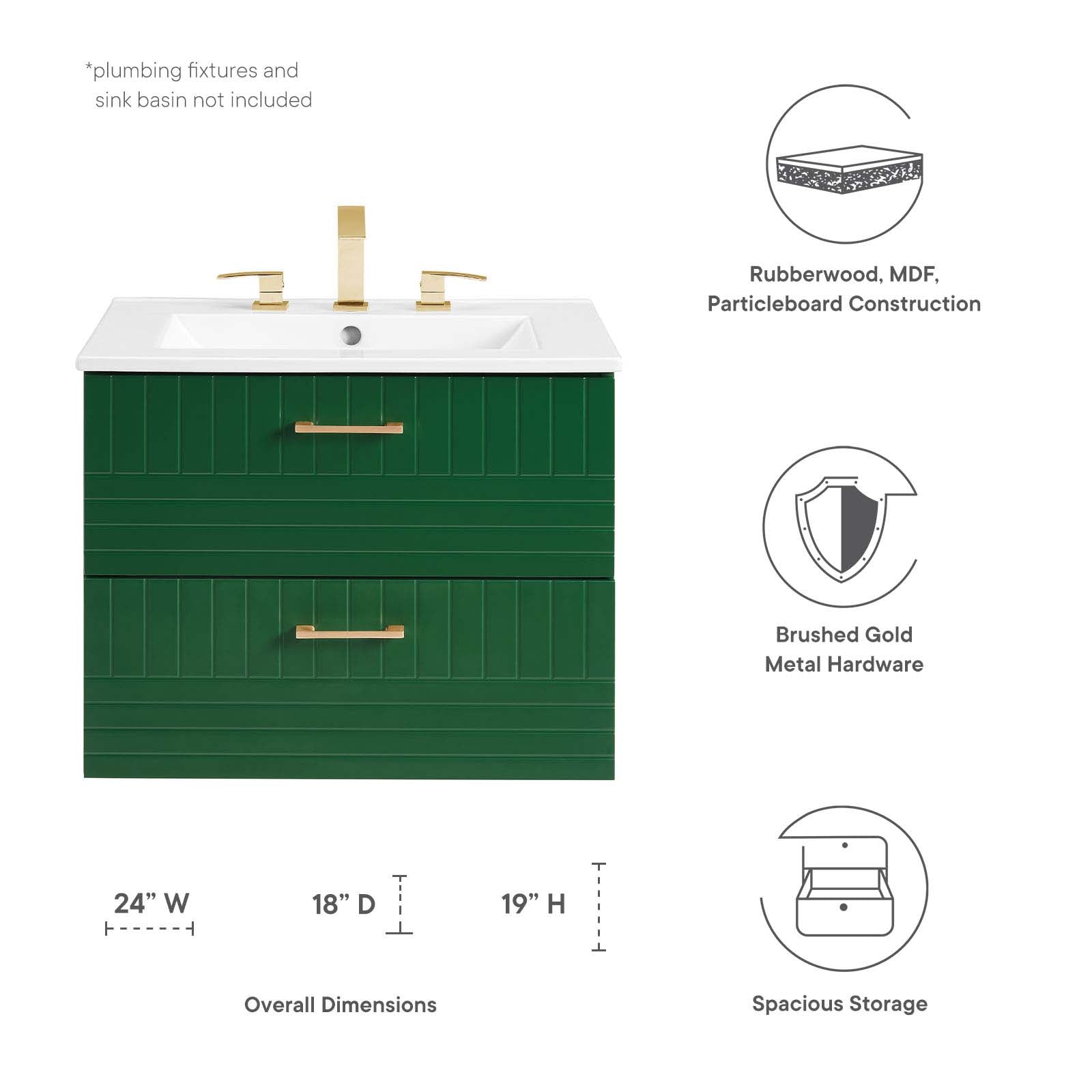 Refresh your bathroom space with the contemporary style of the Daybreak 24" Wall-Mount Bathroom Vanity. Featuring a modern silhouette, sophisticated matte finish, and brushed gold metal hardware, this vanity is durably crafted with a blend of rubberwood, MDF, and particleboard to create a lasting vanity for your bathroom. Mounting directly to your wall and saving substantial floor space, this bathroom vanity is complete with ample storage in its drawers to accommodate bathroom essentials and a cut-out design in the top drawer for plumbing. Assembly required. Sink basin and fixtures not included. Set Includes: One - Daybreak Daybreak Bathroom Vanity Cabinet (Sink Basin Not Included)
