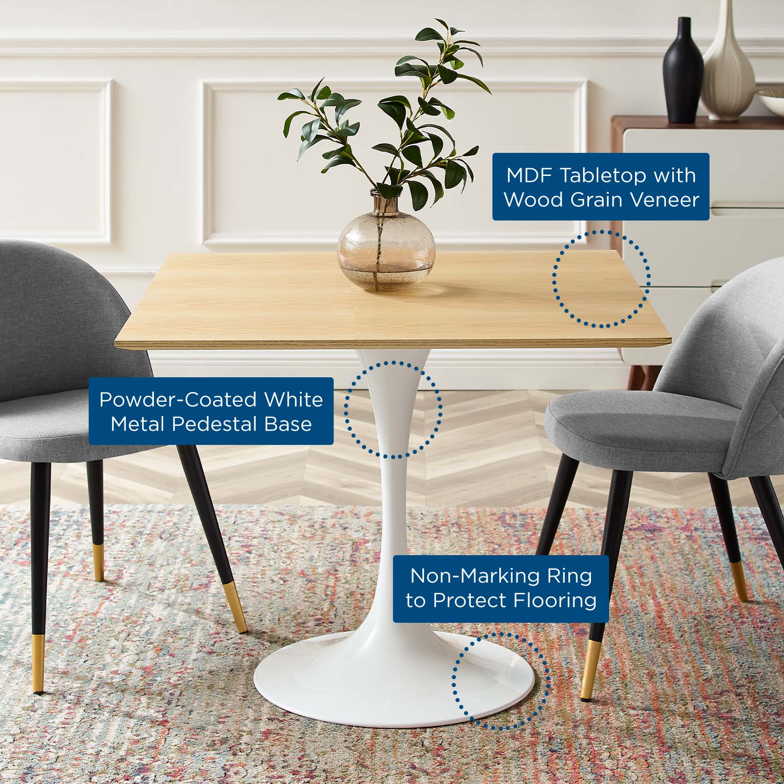 Reflecting a seamless organic shape and timeless form, the Lippa side table has become a symbol of modernism for over the past 60 years. Before its release, homes were filled with clunky remnants of an industrial age long gone by. But in order to advance into the new world, homes first had to transition from the traditional square table, into a piece that connoted progress. The base and dimensions are true to the original specifications, while the table’s square MDF top has an easy-to-clean wood grain veneer, and the metal tapered base features a powder-coated finish. Set Includes: One - Lippa 36" Square Dining Table