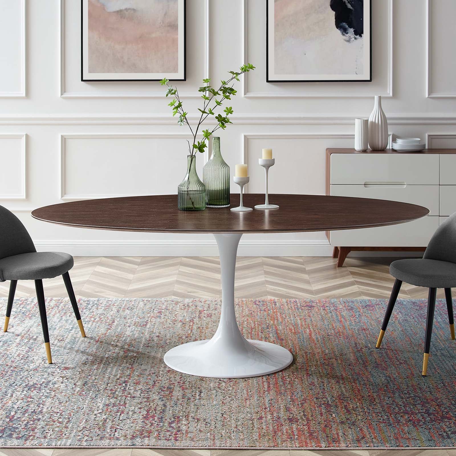 Reflecting a seamless organic shape and timeless form, the Lippa side table has become a symbol of modernism for over the past 60 years. Before its release, homes were filled with clunky remnants of an industrial age long gone by. But in order to advance into the new world, homes first had to transition from the traditional square table, into a piece that connoted progress. The base and dimensions are true to the original specifications, while the table’s oval MDF top has an easy-to-clean wood grain veneer, and the metal tapered base features a powder-coated finish. Set Includes: One - Lippa 78" Oval Dining Table