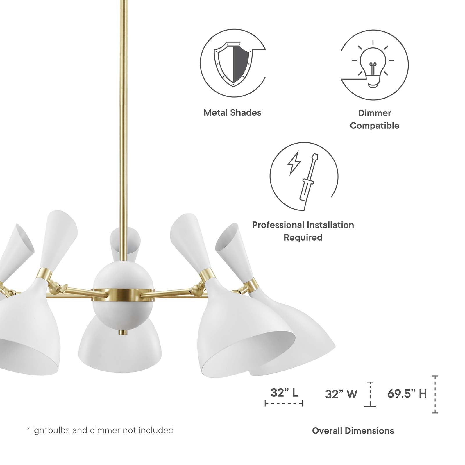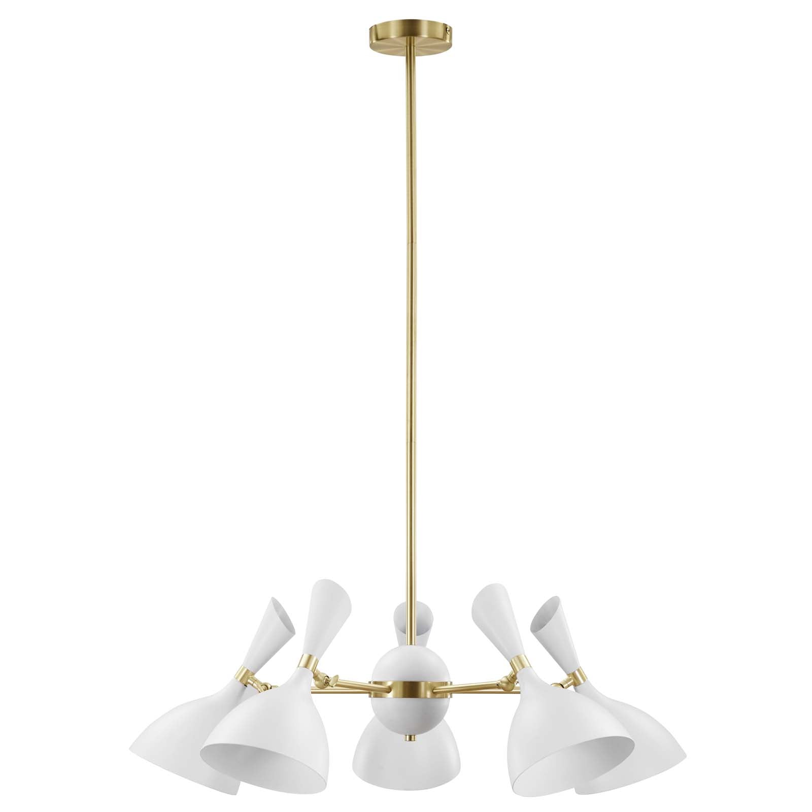 Feel inspired with illuminating bouquets of light in your living room, bedroom, or entryway with the Declare 5-Light Pendant. This modern ceiling light fixture glows with 5 round tapered powder-coated metal shades, enhanced by a narrow satin brass ring, for a bouquet-like silhouette. Sophisticated adjustable shades spark visual interest to this living room chandelier, complementing mid-century modern or eclectic decors. The Declare ceiling pendant light is fully dimmable and height adjustable in your dining room or above a kitchen island. Requires 5 E26 bulbs, 40W max, or LED equivalent (not included). Compatible with dimmer switches (not included). Professional installation required. Set Includes: One - Declare 5-Light 6" Arm Pendant