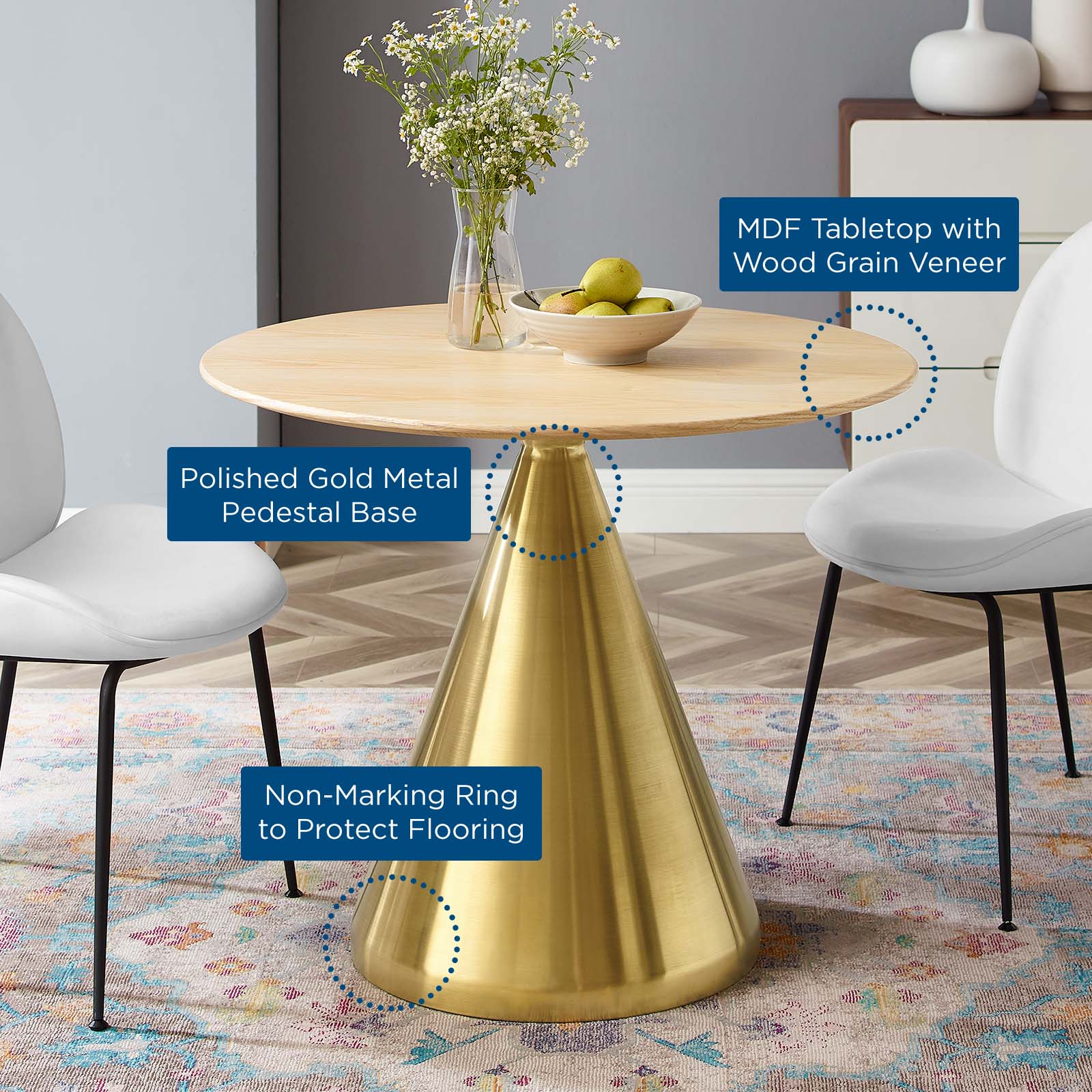 Connect with family and friends over good food and conversation with the Tupelo 36" Dining Table. Inspired by modern style and mid-century influence, this pedestal table reflects an organic shape and is perfect for entertaining or everyday dining. This dining table rests on a conical polished gold metal pedestal base and features a 36" tabletop crafted with MDF and wood grain veneer. Non-marking ring to protect flooring. Assembly required. Set Includes: One - Tupelo 36" Dining Table