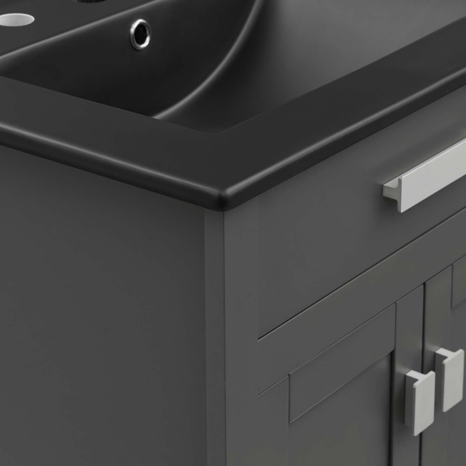 Incorporate refreshing style in the bathroom with the Laguna 24" Bathroom Vanity. Featuring crisp, clean lines and a streamlined design, this vanity is durably crafted with painted MDF and boasts a faux drawer front for added interest. Raised off the ground by simple legs, this bathroom vanity features spacious storage behind soft-close doors with an adjustable shelf to accommodate bathroom essentials. Featuring a ceramic sink basin with 8-inch centerset holes and an integrated countertop, this bathroom vanity aligns style with function for the modern bathroom. Laguna includes square handle pulls and non-marking foot caps to protect flooring. Assembly required, fixtures not included. Set Includes: One - 24" Ceramic basin top One - VANITY