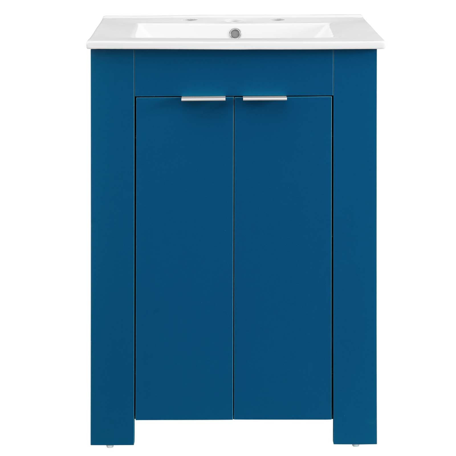 Incorporate modern aesthetics and contemporary style into your bathroom decor with the Maybelle 24" Bathroom Vanity. This vanity features a durable melamine construction with ample storage space for all your bathroom essentials behind two soft-close hinge doors with metal L-shaped handle pulls. Continuing the look of this modern vanity is a ceramic sink with an integrated countertop and 8" centerset faucet holes. A complete addition to the bathroom, this sink vanity rests on low-profile legs to slightly elevate it off the floor. Assembly required. Sink fixtures not included. Set Includes: One - Cayman 24" Bathroom Sink One - VANITY in Melamine lamination