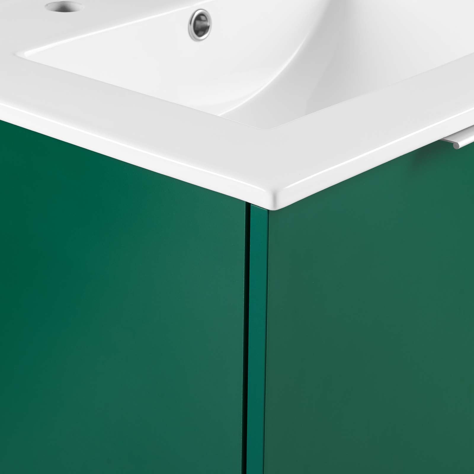 Incorporate modern aesthetics and contemporary style into your bathroom decor with the Maybelle 24" Bathroom Vanity. This vanity features a durable melamine construction with ample storage space for all your bathroom essentials behind two soft-close hinge doors with metal L-shaped handle pulls. Continuing the look of this modern vanity is a ceramic sink with an integrated countertop and 8" centerset faucet holes. Mounting directly to the wall, this bathroom sink vanity saves a substantial amount of floor space. Assembly required. Sink fixtures not included. Set Includes: One - Cayman 24" Bathroom Sink One - VANITY in Melamine lamination