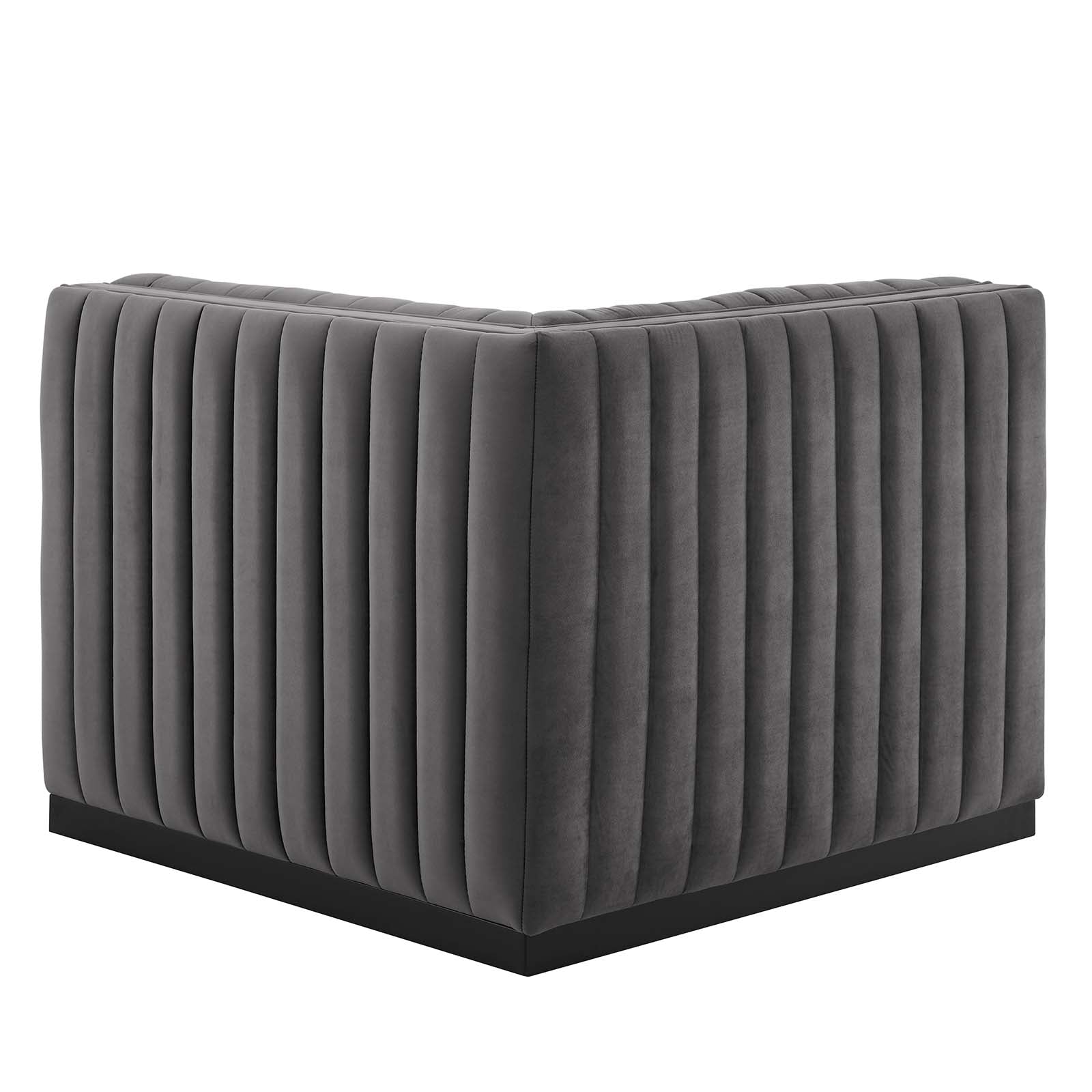 Modern appeal surrounds the Conjure Channel Tufted Performance Velvet Upholstered Left Corner Chair. Luxuriously soft, stain-resistant performance velvet upholstery covers dense foam padding and an individually wrapped spring coil system for a supportive living room chair that will become the go-to lounge spot for family and friends. Vertical channel tufting and subtle French piping adds depth to this vintage inspired sectional piece that effortlessly becomes the focal point in your living room. Solidly constructed from wood and plywood, this corner chair features non-marking foot caps and boasts a matte black base. Versatile and elegant, this sectional sofa piece is ideally suited for a variety of decor styles in your living room, lounge, or home office. Chair Weight Capacity: 331 lbs. Set Includes: One - Conjure Channel Tufted Left Corner Chair
