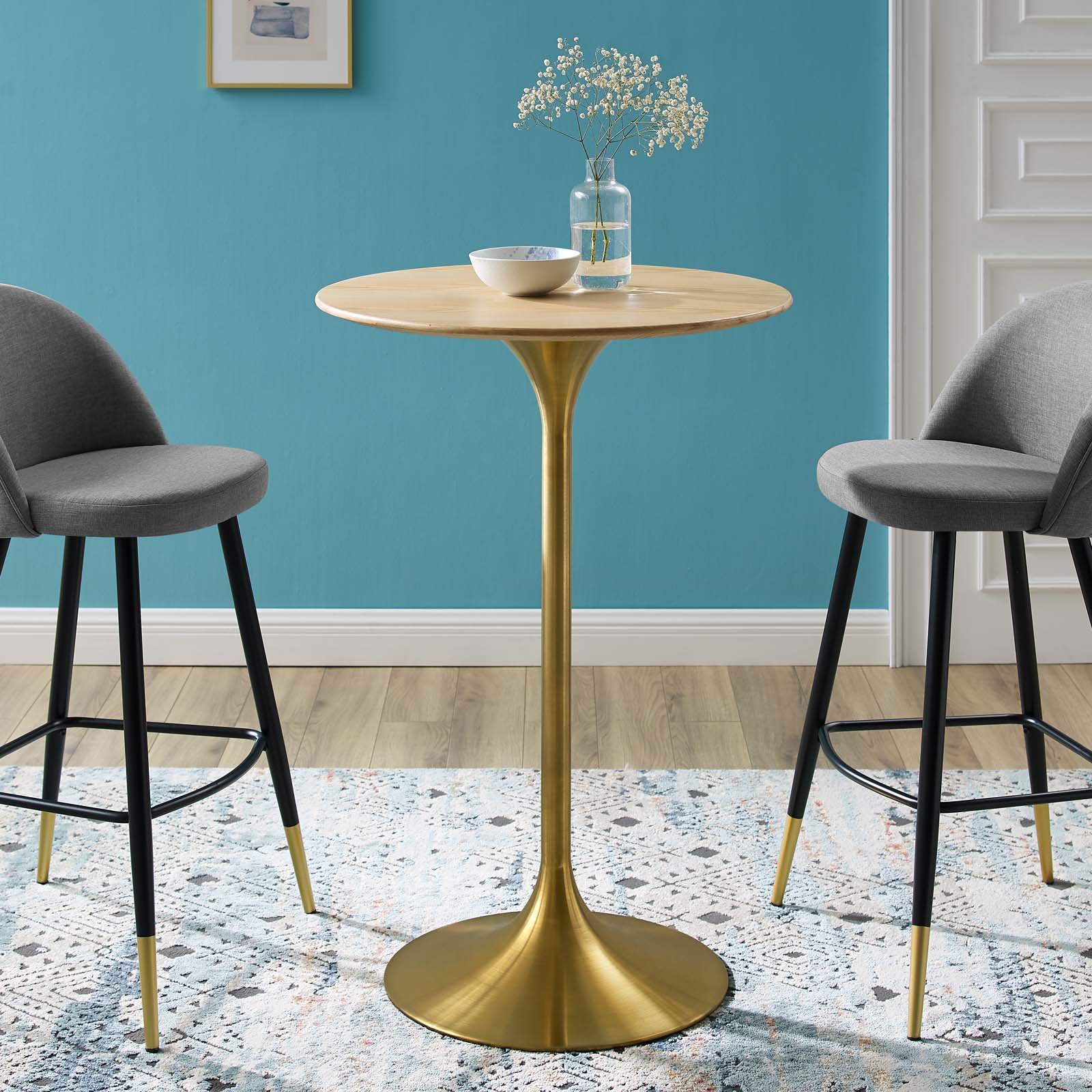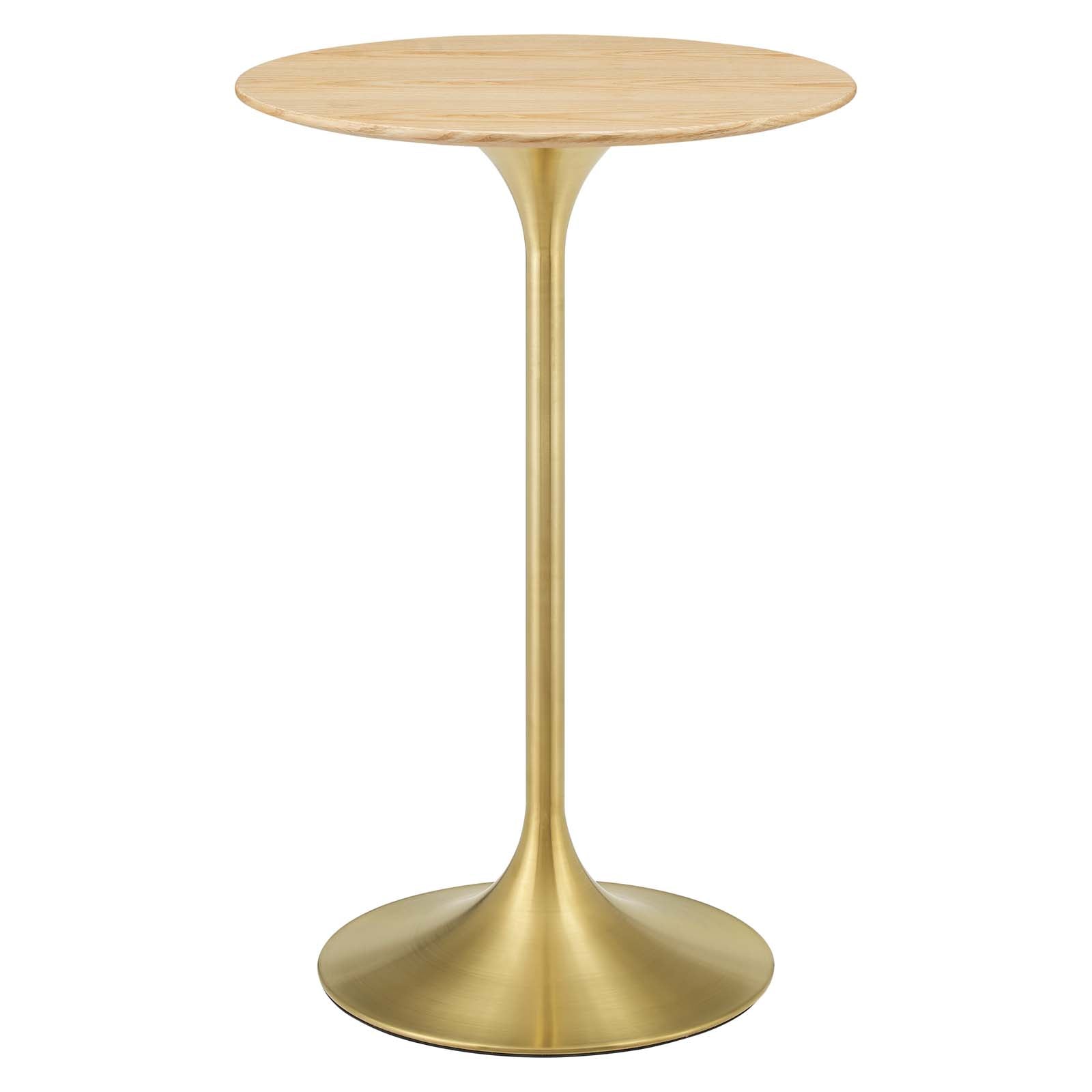Reflecting a seamless organic shape and timeless form, the Lippa Bar Table has become a symbol of modernism for over the past 60 years. Before its release, homes were filled with clunky remnants of an industrial age long gone by. But in order to advance into the new world, homes first had to transition from the traditional oval table, into a piece that connoted progress. The base and dimensions are true to the original specifications, while the table’s round MDF top has an easy-to-clean wood grain veneer, and the metal tapered base features a brushed gold finish. Set Includes: One - Lippa 28" Bar Table