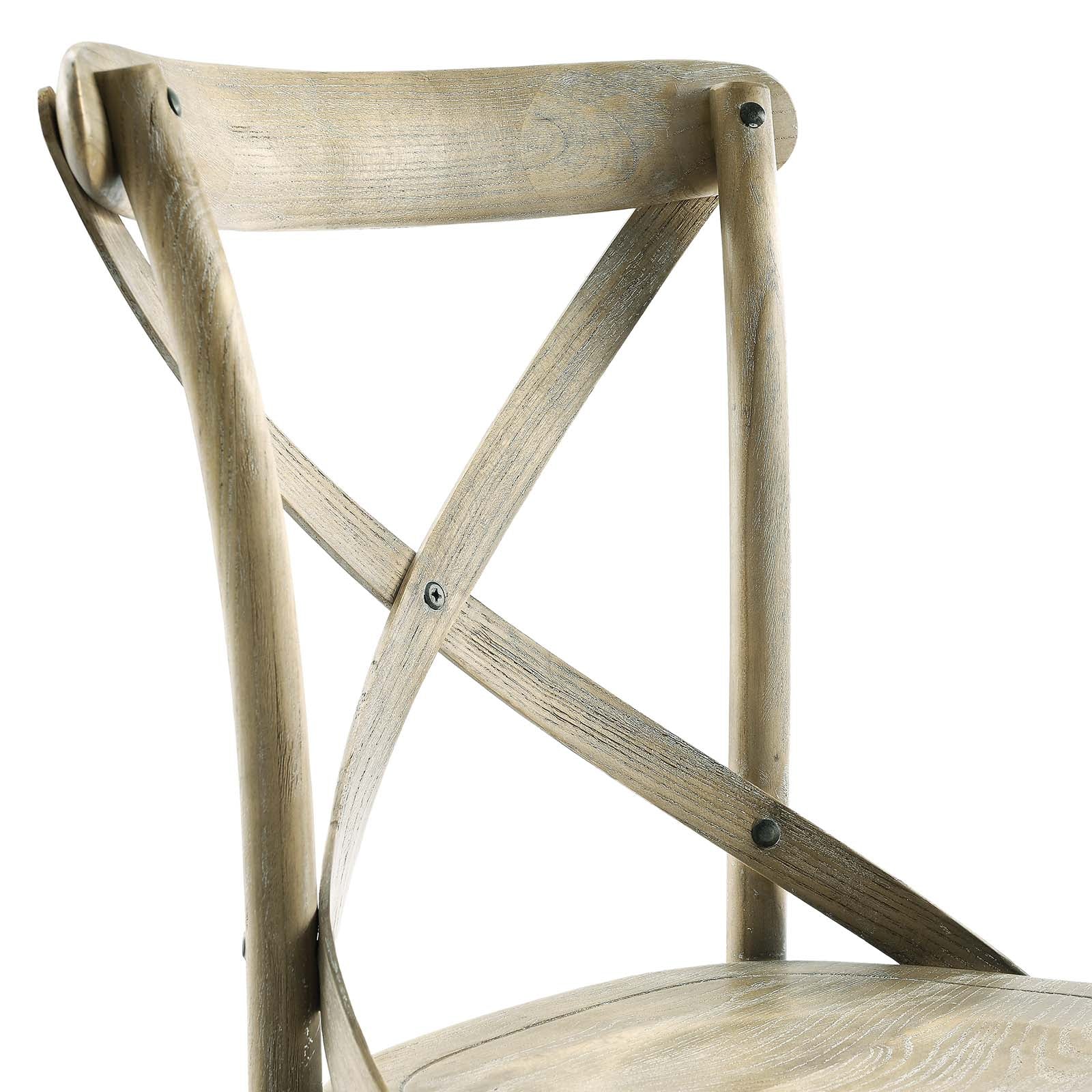 Introduce feelings of nostalgia as you gather around the dining table for a quick breakfast or dinner with friends with the Gear Dining Side Chair. Blending farmhouse charm with modern style, this dining chair features an X-brace back and stretchers between splayed legs. With non-marking foot caps to protect flooring, this side chair is durably crafted with durable elm wood for a sturdy construction built to last. Make a statement in your dining space or kitchen nook with this versatile wood dining chair that can also be used as an accent chair in a living room or desk chair in a home office. Weight Capacity: 330 lbs. Set Includes: One - Gear Dining Side Chair