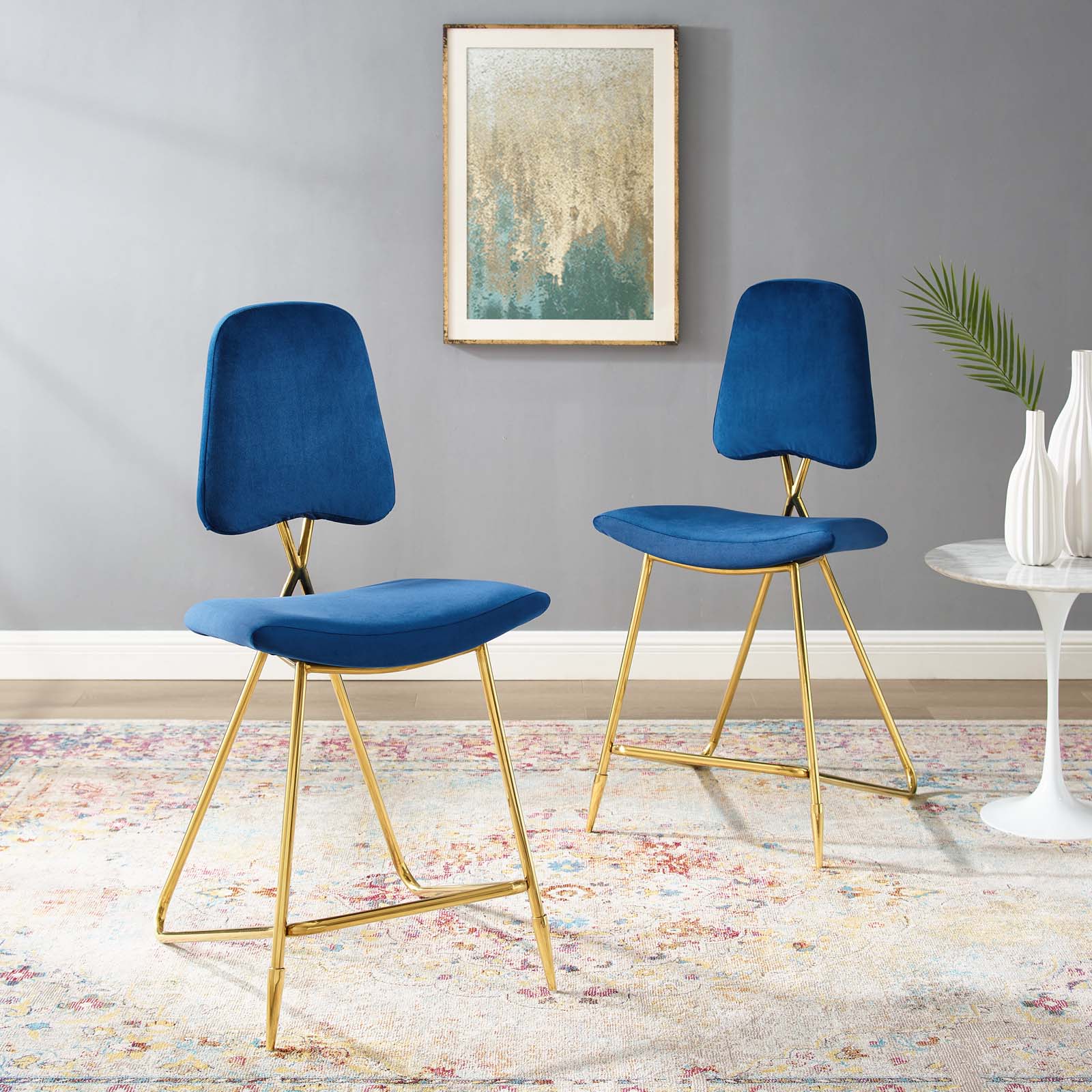 Survey your surroundings with confidence with the Ponder Upholstered Performance Velvet Dining Room Counter Stool. Ponder’s padded high-density foam seat gently slopes upward providing embracing comfort while the tapered back provides ergonomic support. Finely upholstered in stain-resistant performance velvet polyester, the Ponder Dining Stool makes a striking statement with its gold stainless steel base featuring two angled front sleek legs and a rear tripod base. Accentuate your modern decor with a contemporary dining room or counter stool that elevates any empty area of your home. Counter Stool Weight Capacity: 330 lbs. Set Includes: Two - Ponder Counter Stool