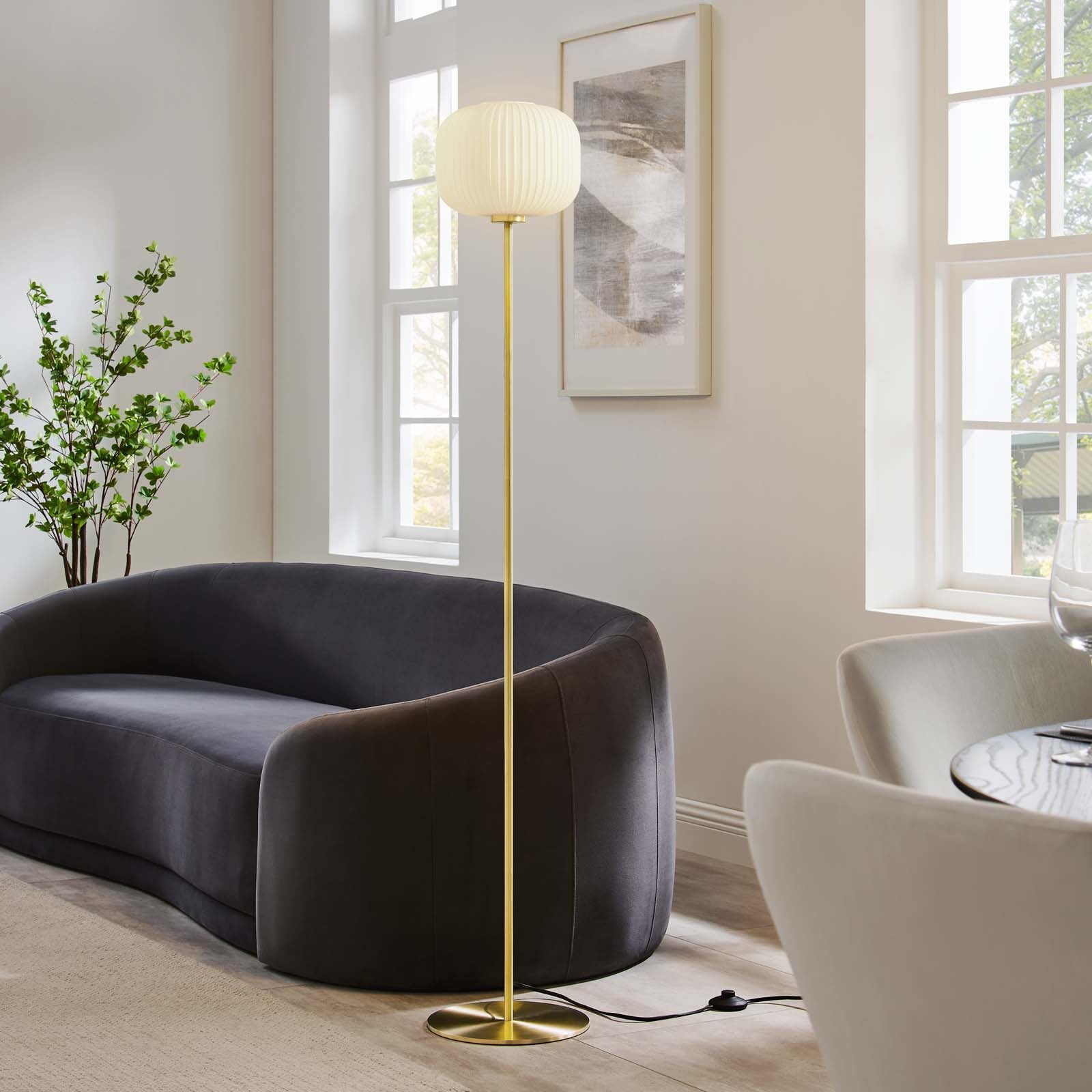 Introduce ingenuity and nuanced retro style into your home lighting design. The iconically shaped Reprise Glass Sphere Floor Lamp brings structure, texture, and a warm transparent glow in your bedroom, living room, entryway, or office. The opaque glass shade is softly textured with embossed horizontal lines creating a commanding living room floor lamp in mid-century modern, contemporary, or eclectic decors. This tall standing lamp combines elegance and functionality with rich satin brass accents and an open top allowing easy bulb access. Reprise is a dimmable standing lamp for the bedroom (dimmer switch not included), requiring 1 E26 60W max bulb or LED equivalent (not included). Easy access on/off floor switch on a black cable. Assembly required. Clean with a soft, damp cloth. Set Includes: 1 - Reprise