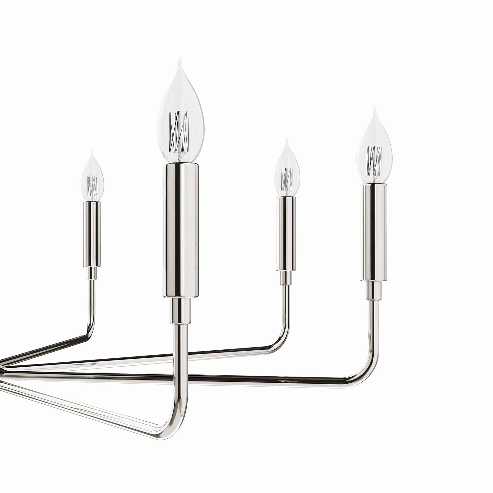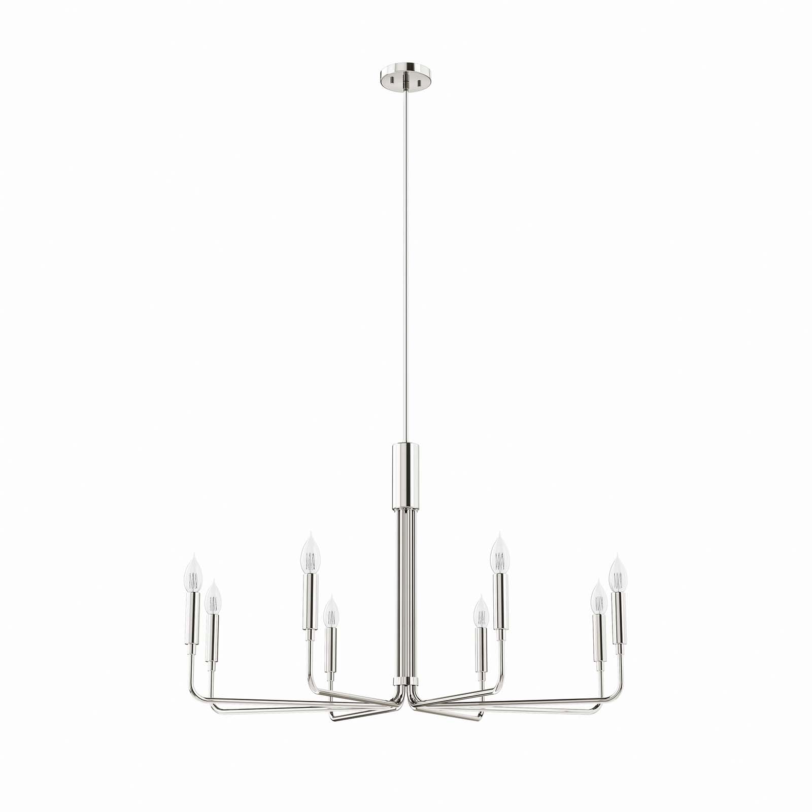 Illuminate your living space with the artful elegance of the Rekindle 8-Light Chandelier that complements a variety of decors from mid-century modern to minimalist contemporary. A timeless piece for your living room, dining room, entryway, or office space, this chandelier light features eight sleek arms that extend out from a cylindrical centerpiece with ceramic lamp holders to host exposed light bulbs. Compatible with sloped ceilings, Rekindle has a ceiling canopy with a swivel adaptor and features a five piece, height-adjustable hanging rod to suit a range of ceiling heights. The Rekindle Light Fixture is ETL listed for damp locations and requires eight E12 light bulbs 60W max or LED equivalent (not included). Luminaires that are ÒSuitable for Damp LocationsÓ are approved for areas that are regularly exposed to moisture and condensation. Professional installation required. Set Includes: One - Rekindle 8-Light Chandelier