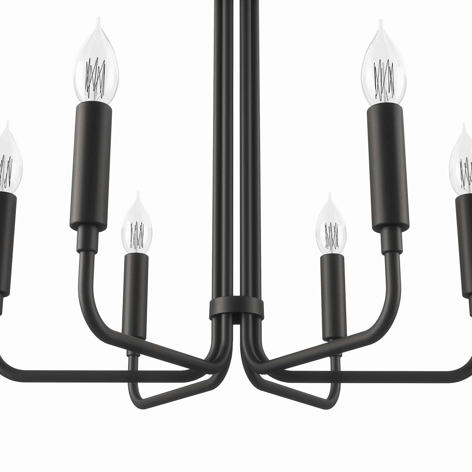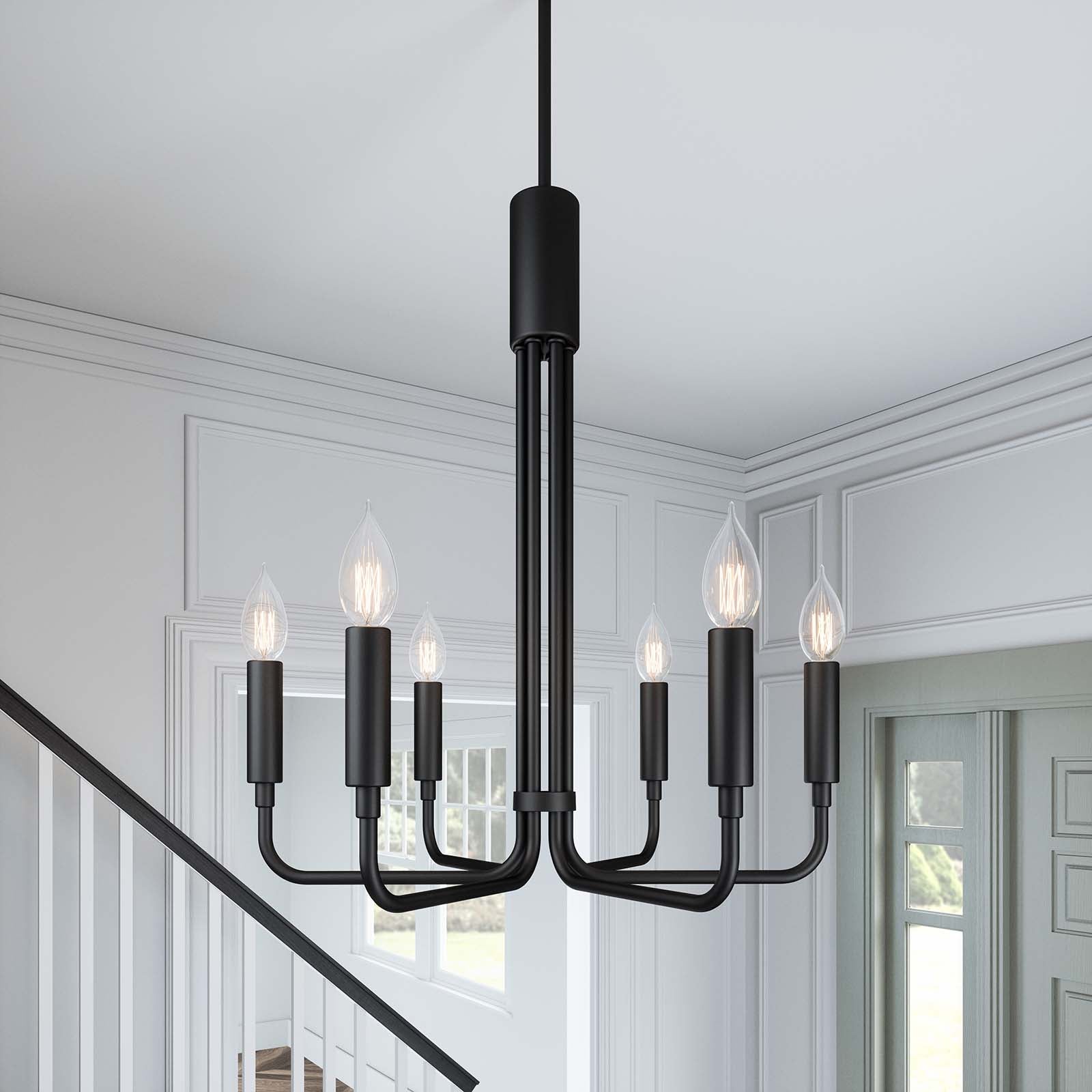 Illuminate your living space with the artful elegance of the Rekindle 6-Light Chandelier that complements a variety of decors from mid-century modern to minimalist contemporary. A timeless piece for your living room, dining room, entryway, or office space, this chandelier light features six sleek arms that extend out from a cylindrical centerpiece with ceramic lamp holders to host exposed light bulbs. Compatible with sloped ceilings, Rekindle has a ceiling canopy with a swivel adaptor and features a five piece, height-adjustable hanging rod to suit a range of ceiling heights. The Rekindle Light Fixture is ETL listed for damp locations and requires six E12 light bulbs 60W max or LED equivalent (not included). Luminaires that are ÒSuitable for Damp LocationsÓ are approved for areas that are regularly exposed to moisture and condensation. Professional installation required. Set Includes: One - Rekindle 6-Light Chandelier