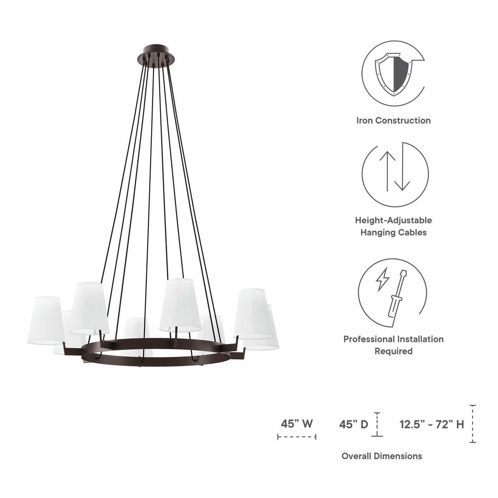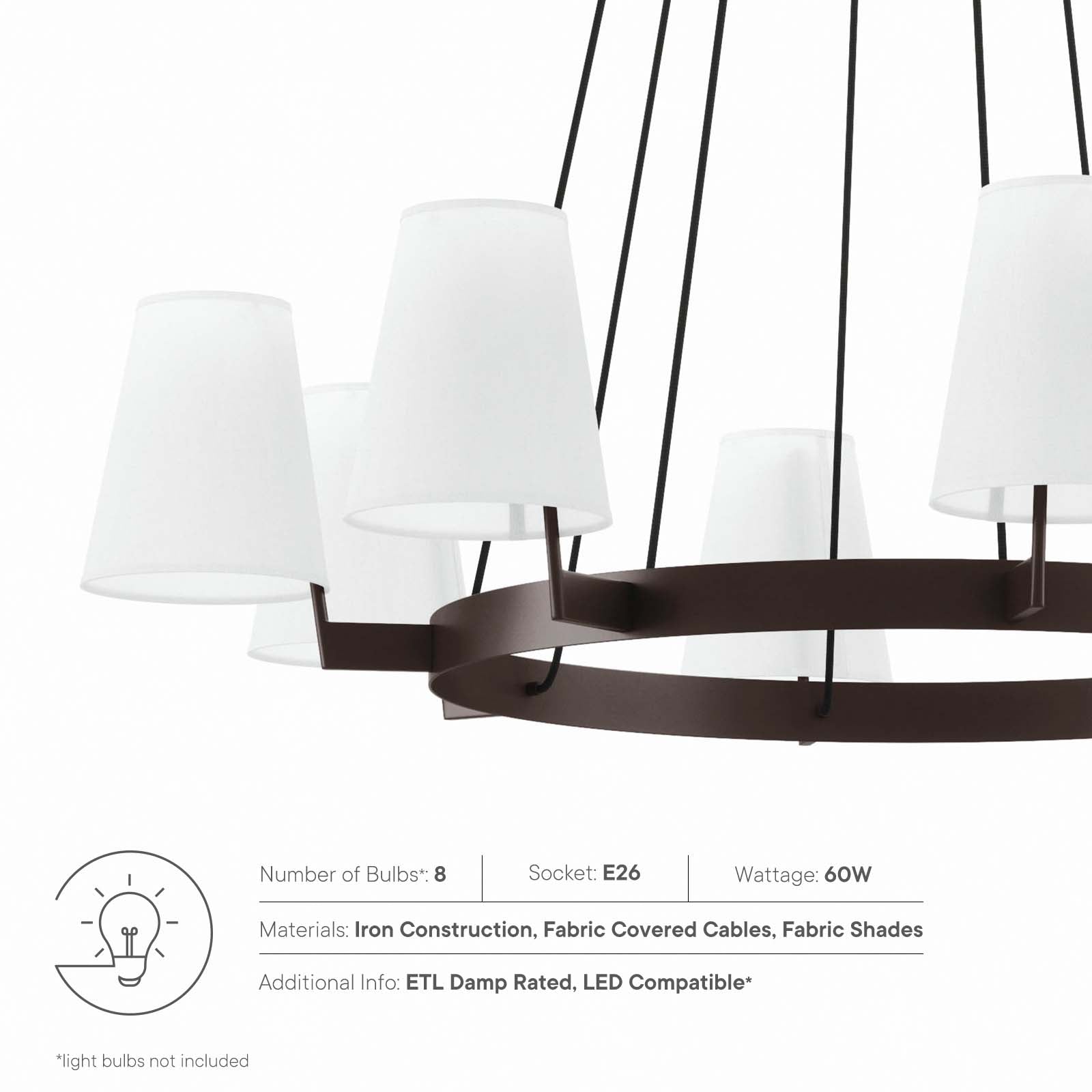 Cover your living space in a peaceful illumination from the Surround 8-Light Chandelier. Designed to light up the living room, kitchen, dining room, bedroom, or entryway, this pendant light features a circle of eight fabric cone shades and is suspended by eight height-adjustable cables making it customizable to a variety of ceiling heights. Surround is compatible with sloped ceilings. This pendant chandelier requires professional installation and eight E26 bulbs 60W max or LED equivalent (not included). ETL Listed for Damp Locations. Luminaires that are ÒSuitable for Damp LocationsÓ are approved for areas that are regularly exposed to moisture and condensation. Set Includes: One - Surround 8-Light Chandelier