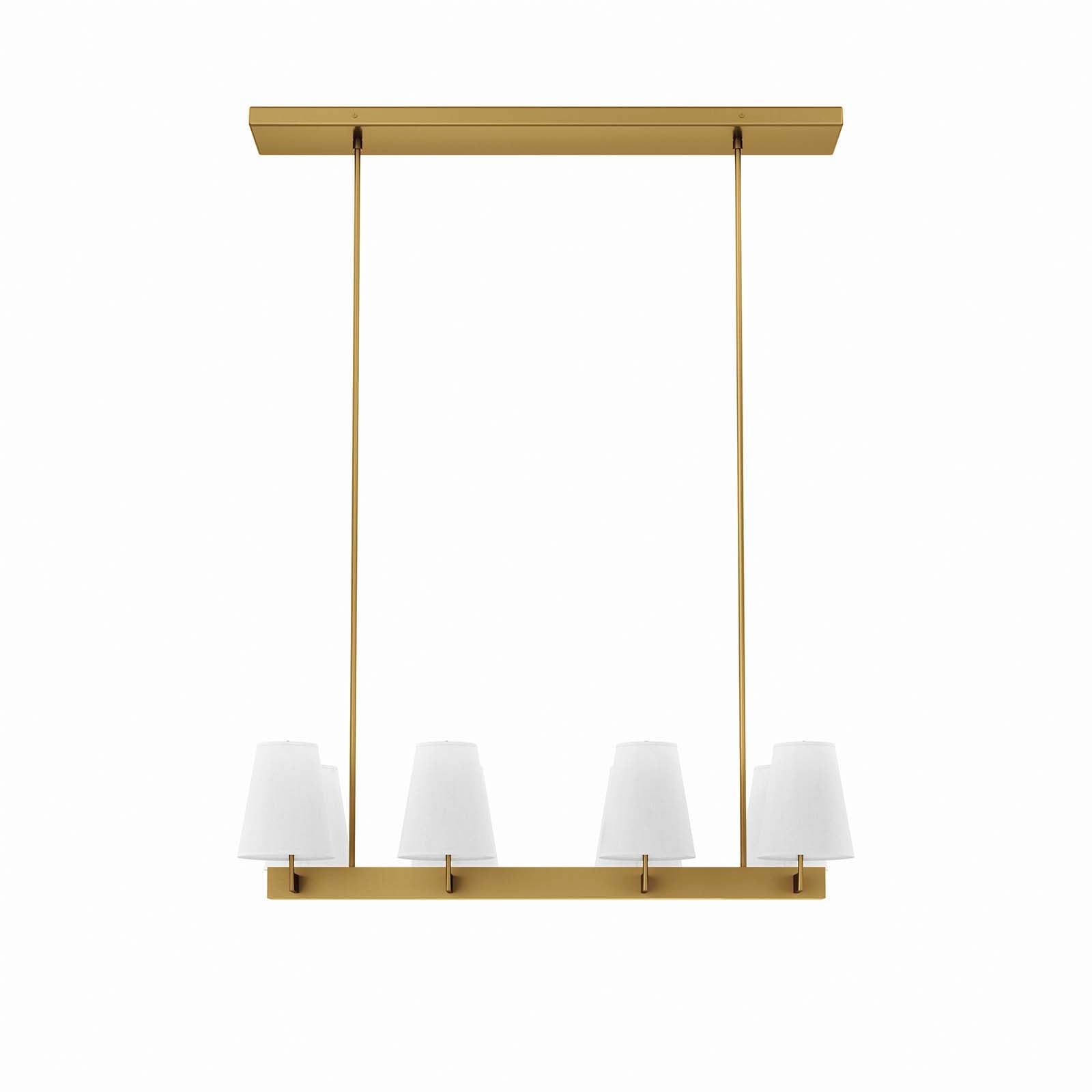 The Enthrall 8-Light Chandelier brings modern grandeur to a living room, dining room, entryway, bedroom, or office. This linear pendant light features two rows of fabric cone shades covering eight lightbulbs that require E26 bulbs 60W maximum or LED equivalent (not included). Compatible with sloped ceilings, Enthrall has a rectangular ceiling canopy with swivel adaptors and features two five-piece, height-adjustable hanging rods to suit a range of ceiling heights. ETL Listed for Damp Locations. Luminaires that are ÒSuitable for Damp LocationsÓ are approved for areas that are regularly exposed to moisture and condensation. Professional installation required. Set Includes: One - Enthrall 8-Light Chandelier