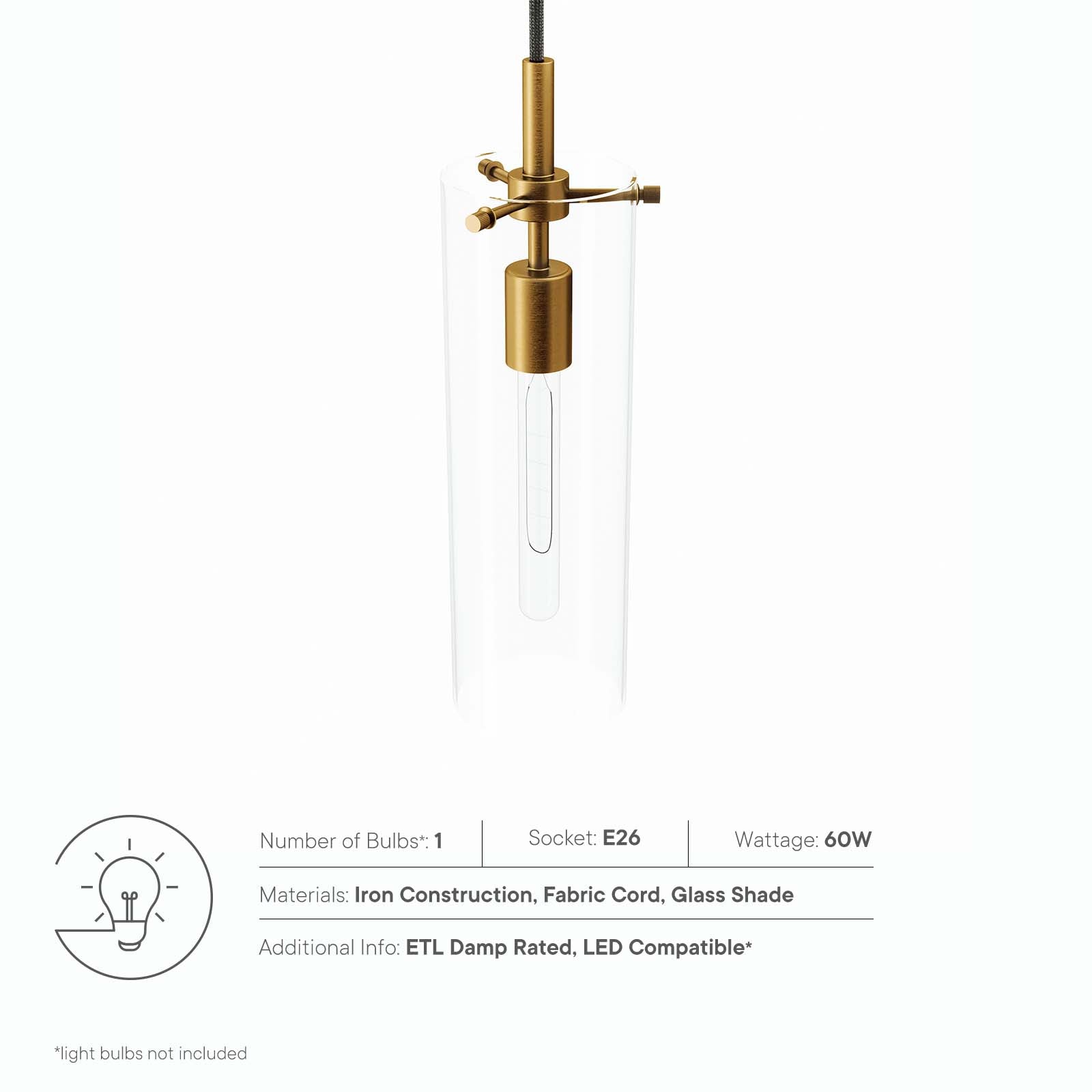 Cover your walls with ambient light with the Skylark 1-Light Pendant Light. A modern update to the dining room, kitchen, entryway, hallway, bedroom, bathroom, or other living space, this hanging light features a single bulb encased in a clear glass cylinder shade. Compatible with sloped ceilings, this pendant light is suspended by a ceiling canopy and an adjustable fabric cable to accomodate a range of ceiling heights. This light fixture requires one E26 bulb 60W max or LED equivalent (not included). This pendant light is damp rated for use in the bathroom. Professional installation required. Set Includes: One - Skylark Pendant Light