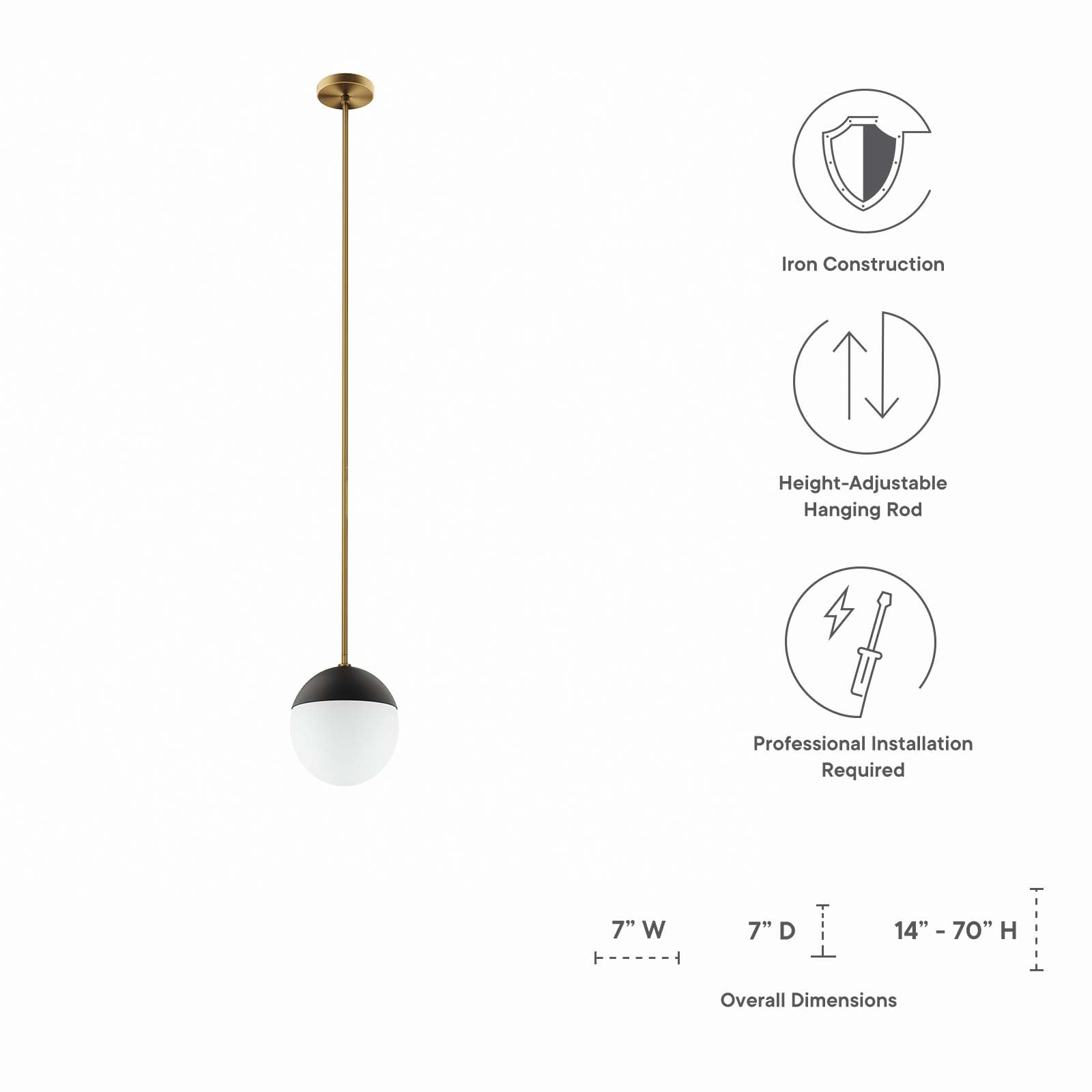Cast a warm, ambient glow around your home or apartment with the Stellar 1-Light Pendant. Adding contemporary charm to a kitchen, dining room, bedroom, office, hallway, entryway, or other living space, this spherical light fixture features a frosted glass shade that attaches to a matte black metal base. Compatible with sloped ceilings, Stellar has a ceiling canopy with a swivel adaptor and features a five piece, height-adjustable hanging rod to suit a range of ceiling heights. This hanging light requires one E26 bulb 60W max or LED equivalent (not included). Damp rated for use in the bathroom. Professional installation required. Set Includes: One - Stellar 1-Light Pendant Light