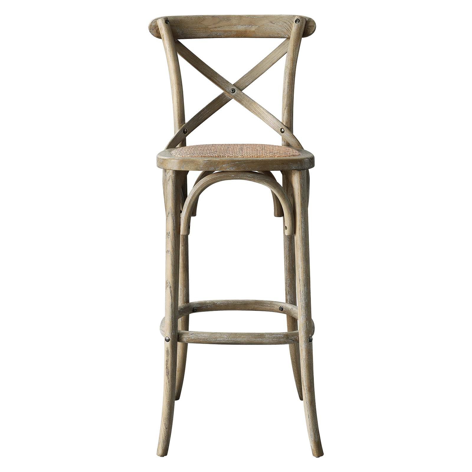 Introduce feelings of nostalgia as you gather around the kitchen counter for a quick breakfast or dinner with friends with the Gear Bar Stool. Blending farmhouse charm with modern style, this bar-height stool features an X-brace back and stretchers between splayed legs. With non-marking foot caps to protect flooring, this bar stool is durably crafted with durable elm wood for a sturdy construction built to last. Make a statement in your dining space or kitchen area with this versatile wood bar stool that is complete with a woven rattan seat for added interest. Weight Capacity: 330 lbs. Set Includes: One - Gear Bar Stool