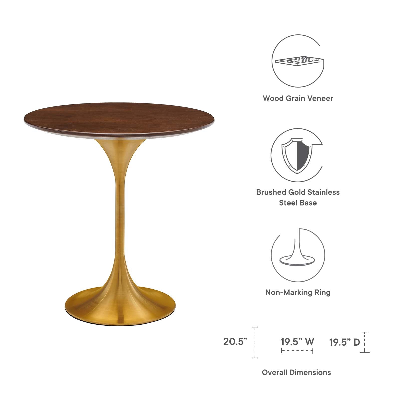 Reflecting a seamless organic shape and timeless form, the Lippa Side Table has become a symbol of modernism for over the past 60 years. Before its release, homes were filled with clunky remnants of an industrial age long gone by. But in order to advance into the new world, homes first had to transition from the traditional square table, into a piece that connoted progress. The base and dimensions are true to the original specifications, while the table’s round MDF top has an easy-to-clean wood grain veneer and rests on a brushed gold stainless steel tapered pedestal base. Set Includes: One - Lippa 20" Round Side Table