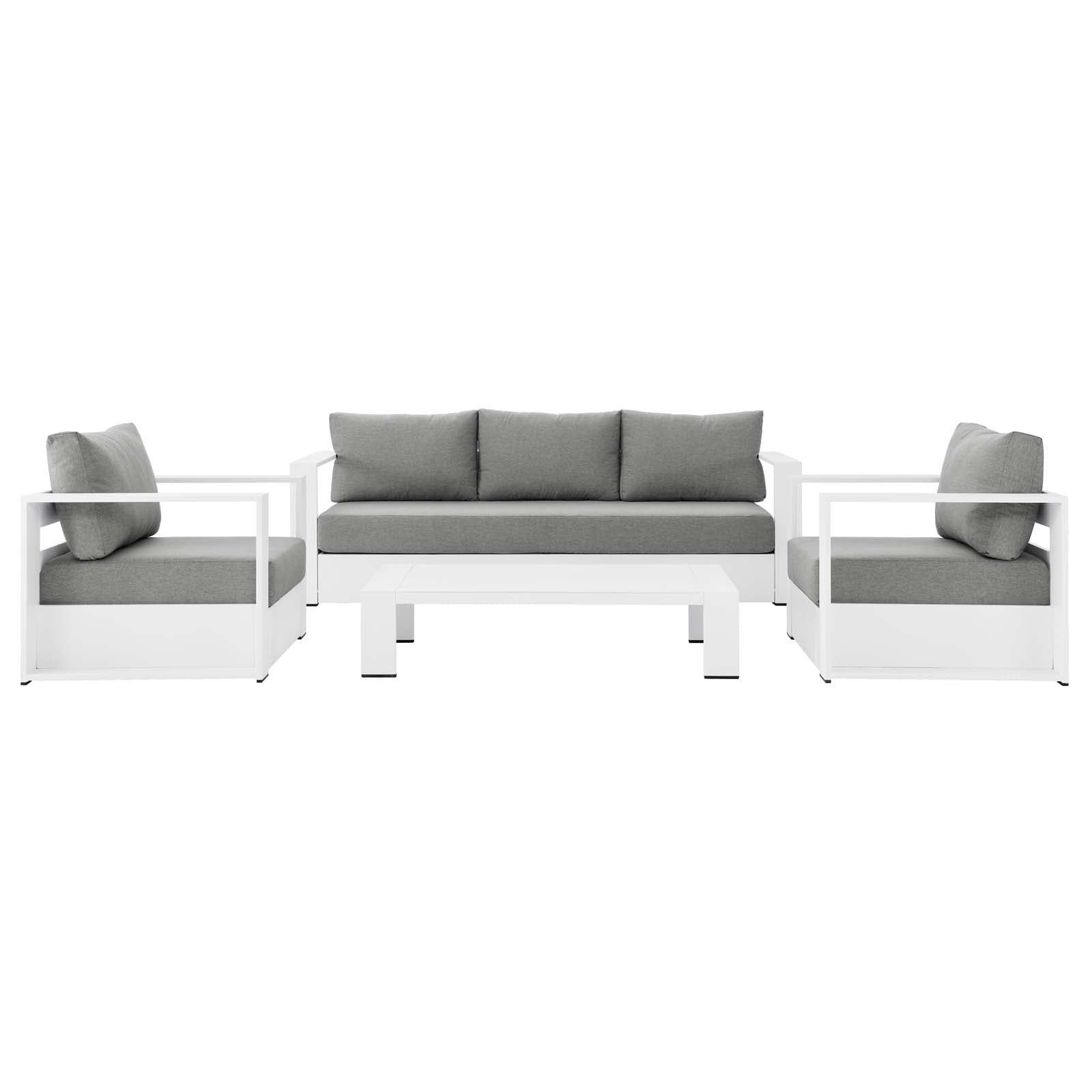 Enliven your alfresco spaces with the Tahoe Aluminum 4-Piece Outdoor Patio Set. This modern outdoor patio set includes two armchairs, a sofa, and a coffee table, crafted with durable powder-coated aluminum, dispensing contemporary elegance in your outdoor lounge spaces. The Tahoe 4-Piece Patio Set is perfect for poolside lounging with a sunproof, water-resistant fabric-covered seat and backrest. With dense foam padding for sustaining comfort and removable, stain-resistant cushions on the sofa and armchairs, this patio set is low maintenance and high performing. A durable patio set, Tahoe comes with easy-to-follow assembly instructions and features non-marking foot glides to protect your deck or patio floor. Weight Capacity - Chair: 331 lbs. Sofa: 993 lbs. Set Includes: One - Tahoe Powder Coffe Table One - Tahoe Powder Sofa Two - Tahoe Powder Armchair
