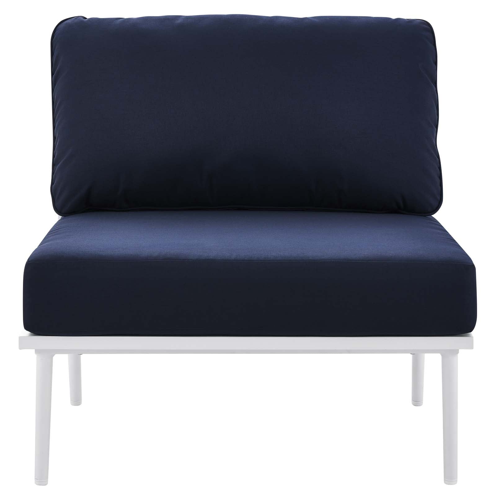 • Dimensions: Overall Product Dimensions: 32"L x 83.5"W x 32.5"H Overall Armless Chair Dimensions: 32"L x 32"W x 32.5"H Seat Cushion Dimensions: 32"L x 22.5"W x 5.5"H Backrest Dimensions: 32"W x 16"H Base Dimensions: 25"L x 29"W Overall Side Table Dimensions: 19.5"L x 19.5"W x 19.5"H