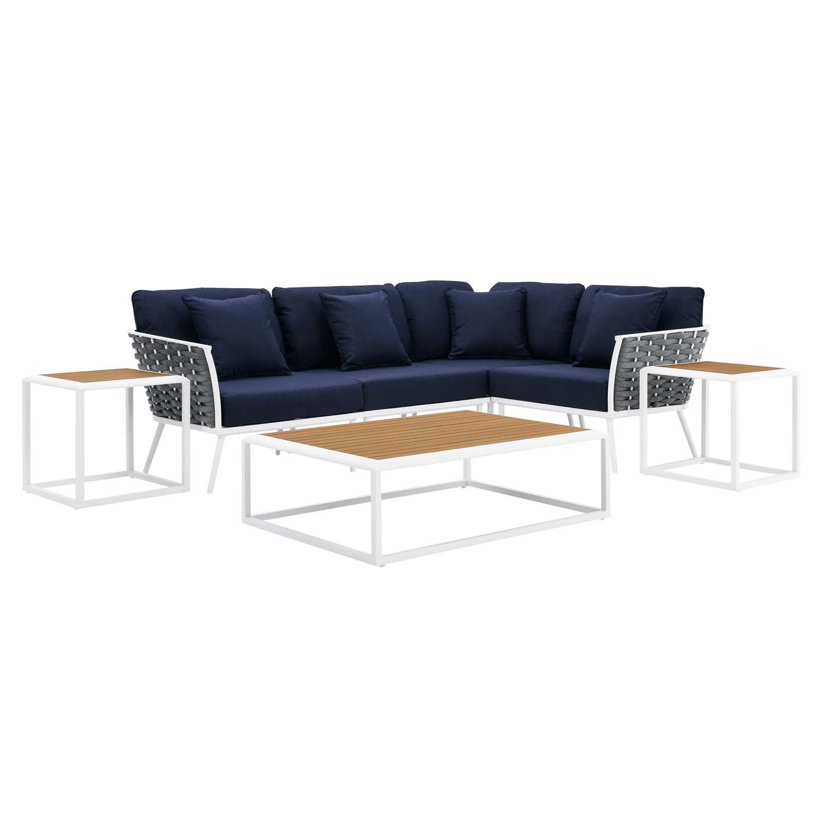 Gather family and friends for pleasant weather and good conversation with the Stance Outdoor Patio Furniture Collection. Boasting a contemporary modern look, the 7-Piece Outdoor Patio Sectional Sofa Set features woven polyester fabric rope seat backs and flared powder-coated aluminum frames, slatted synthetic wood tabletops, and water resistant all-weather fabric cushions with plush 5" thick, dense foam padding provide a relaxing spot to lounge. A versatile set designed for long-lasting durability, each piece in the Stance Collection can be mixed and matched and effortlessly arranged to fit the spontaneous needs of you and your guests. Stance includes non-marking, height-adjustable foot caps. Assembly Required. Set Includes: 1 Left-Arm Chair, 1 Right-Arm Chair, 1 Corner Chair, 1 Armless Chair, 2 Side Tables, 1 Coffee Table Set Includes: One - Stance Aluminum Armless Chair One - Stance Aluminum Coffee Table One - Stance Aluminum Corner Chair One - Stance Aluminum Left-Facing Armchair One - Stance Aluminum Right-Facing Armchair Two - Stance Aluminum Side Table