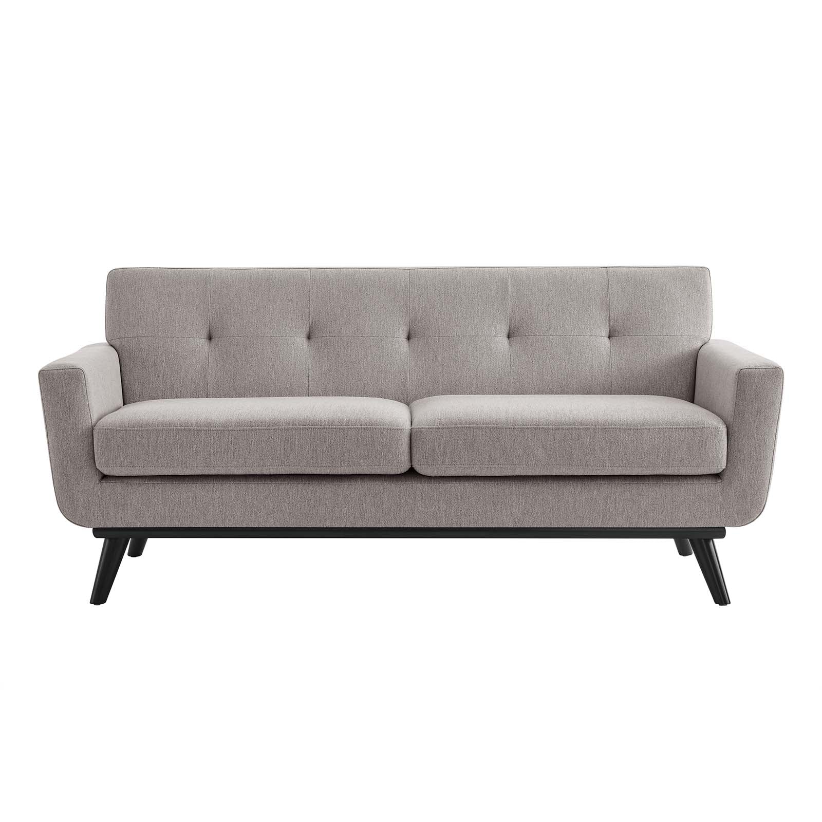 Gently sloping curves and plush seat cushion create a favorite lounging spot. Whether plopping down after a long day at work, settling in with coffee and brunch, or entering a spirited discussion with friends, the Engage Loveseat is a welcome presence in your home. Three tufted buttons create eye-catching appeal, adding depth that brings your sitting dŽcor to center stage. Four black wood legs and frame supply a solid base to the textured fabric upholstery with subtle herringbone detail. Set Includes: One - Engage Herringbone Fabric Loveseat
