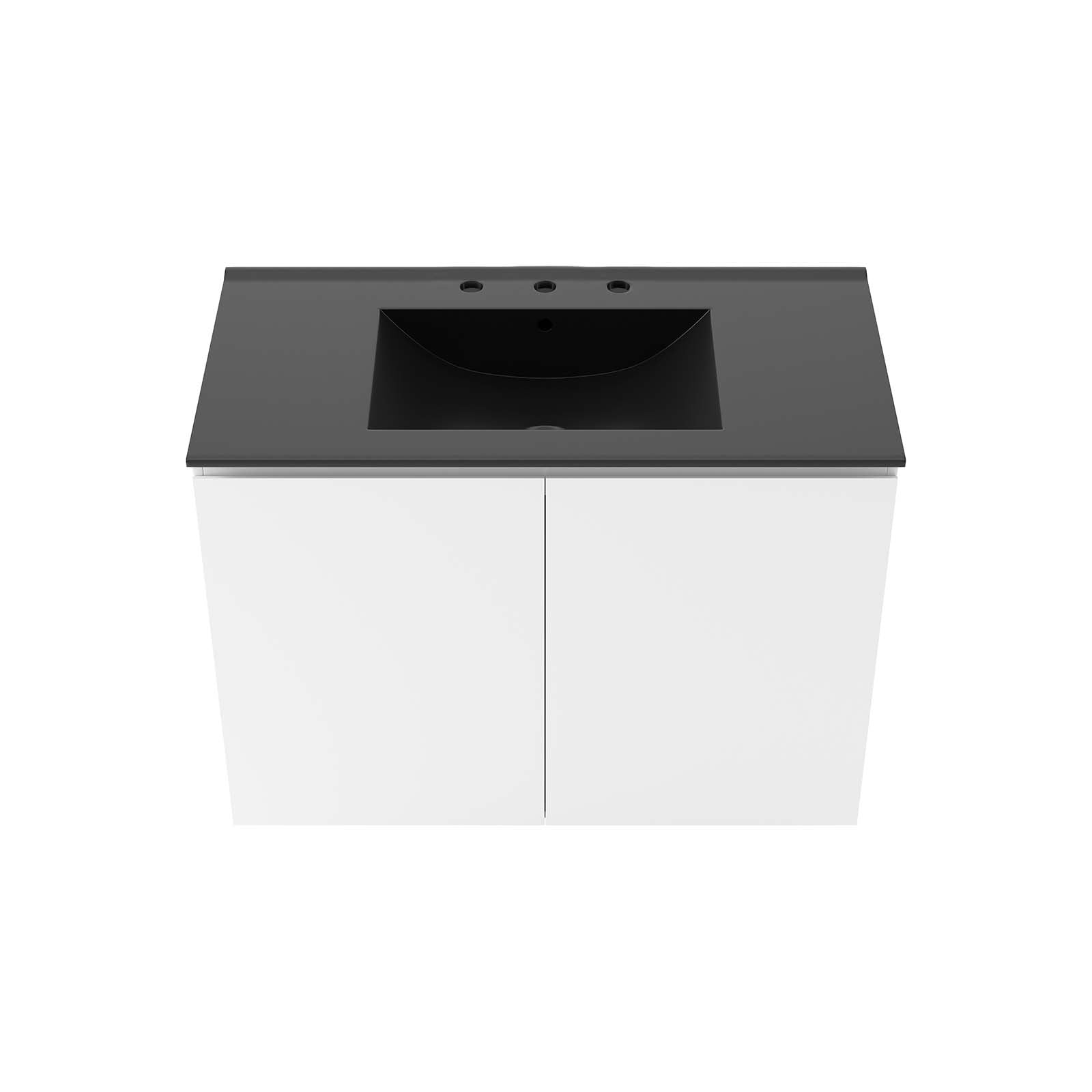 The sleek look and clean-lined silhouette of the Bryn 36" Wall-Mount Bathroom Vanity add modern style to your bathroom space. Durably crafted with particleboard and melamine, this vanity mounts directly to the wall and features ample storage space under the sink behind two soft-close doors. Bryn features a cut-out design to accommodate plumbing. This vanity is complete with a ceramic sink basin with 8-inch centerset holes and an integrated countertop. Fixtures not included. Assembly required. Set Includes: One - Bryn 36" Wall-Mount Bathroom Vanity