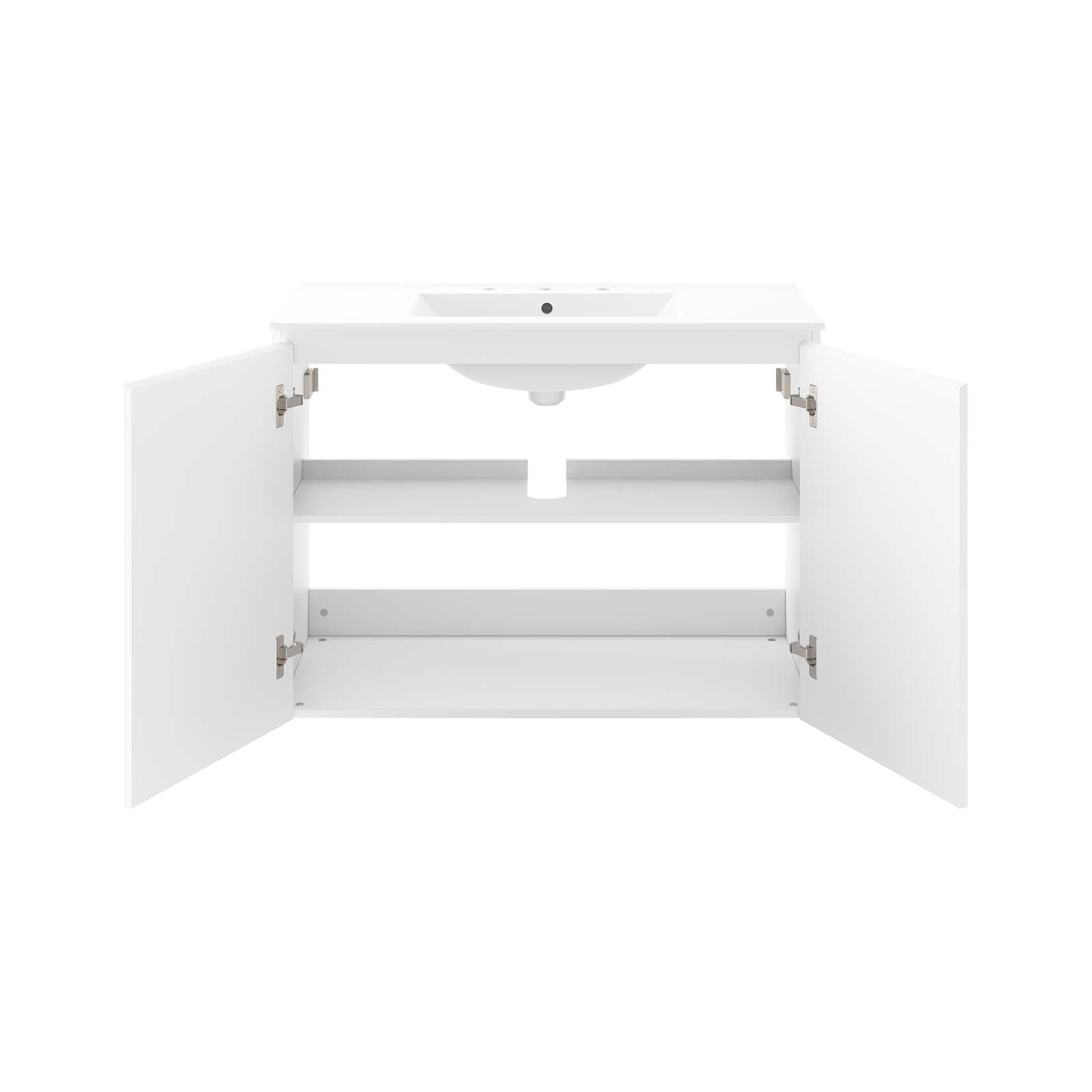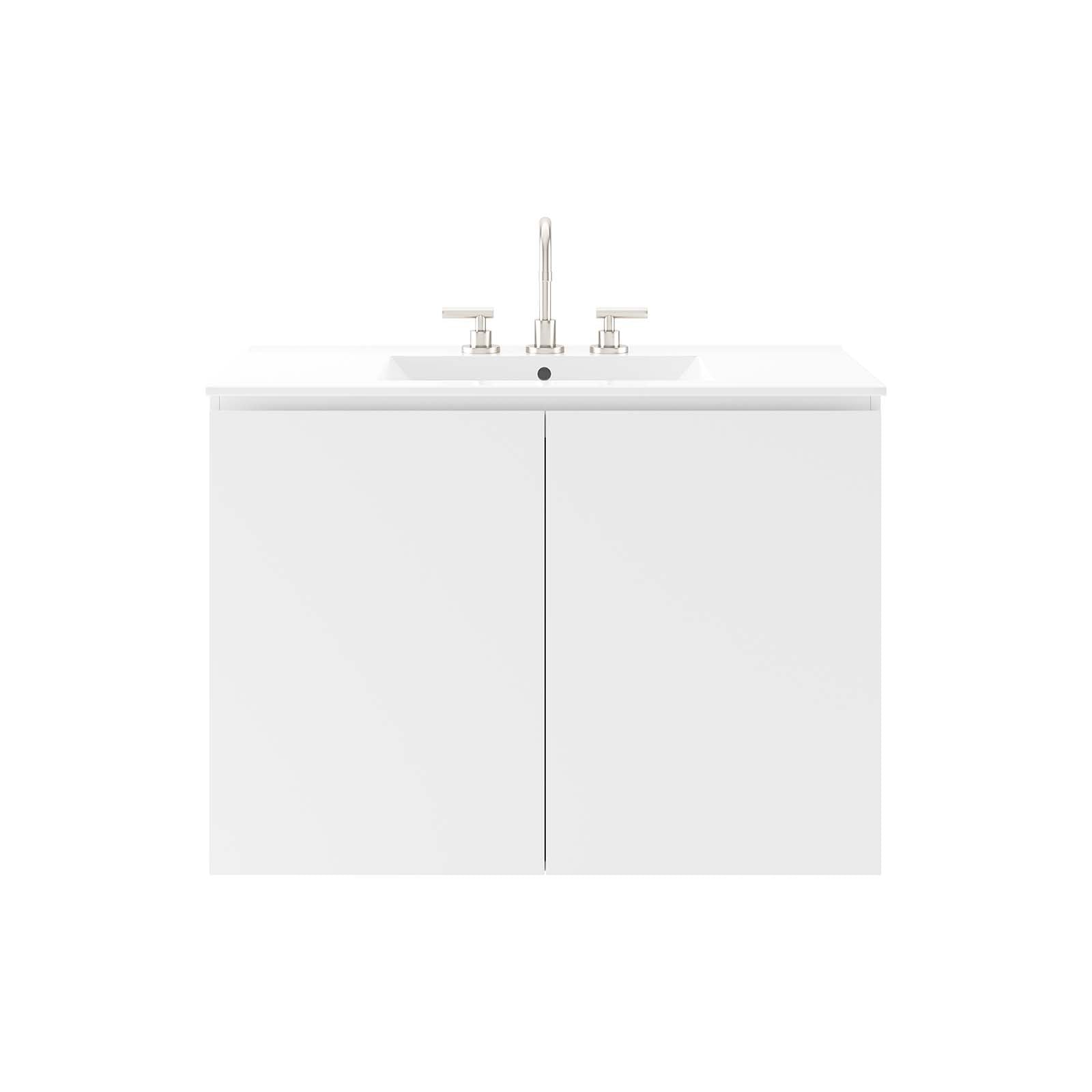 The sleek look and clean-lined silhouette of the Bryn 36" Wall-Mount Bathroom Vanity add modern style to your bathroom space. Durably crafted with particleboard and melamine, this vanity mounts directly to the wall and features ample storage space under the sink behind two soft-close doors. Bryn features a cut-out design to accommodate plumbing. This vanity is complete with a ceramic sink basin with 8-inch centerset holes and an integrated countertop. Fixtures not included. Assembly required. Set Includes: One - Bryn 36" Wall-Mount Bathroom Vanity