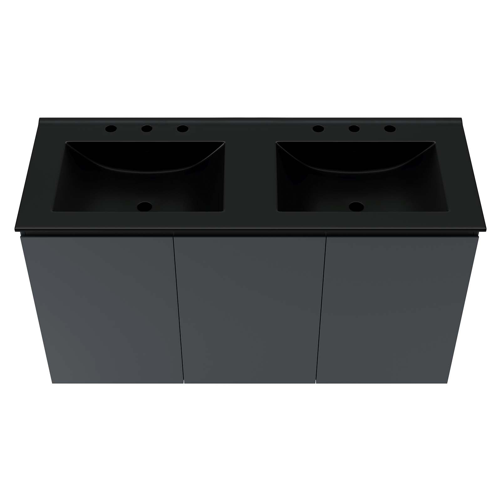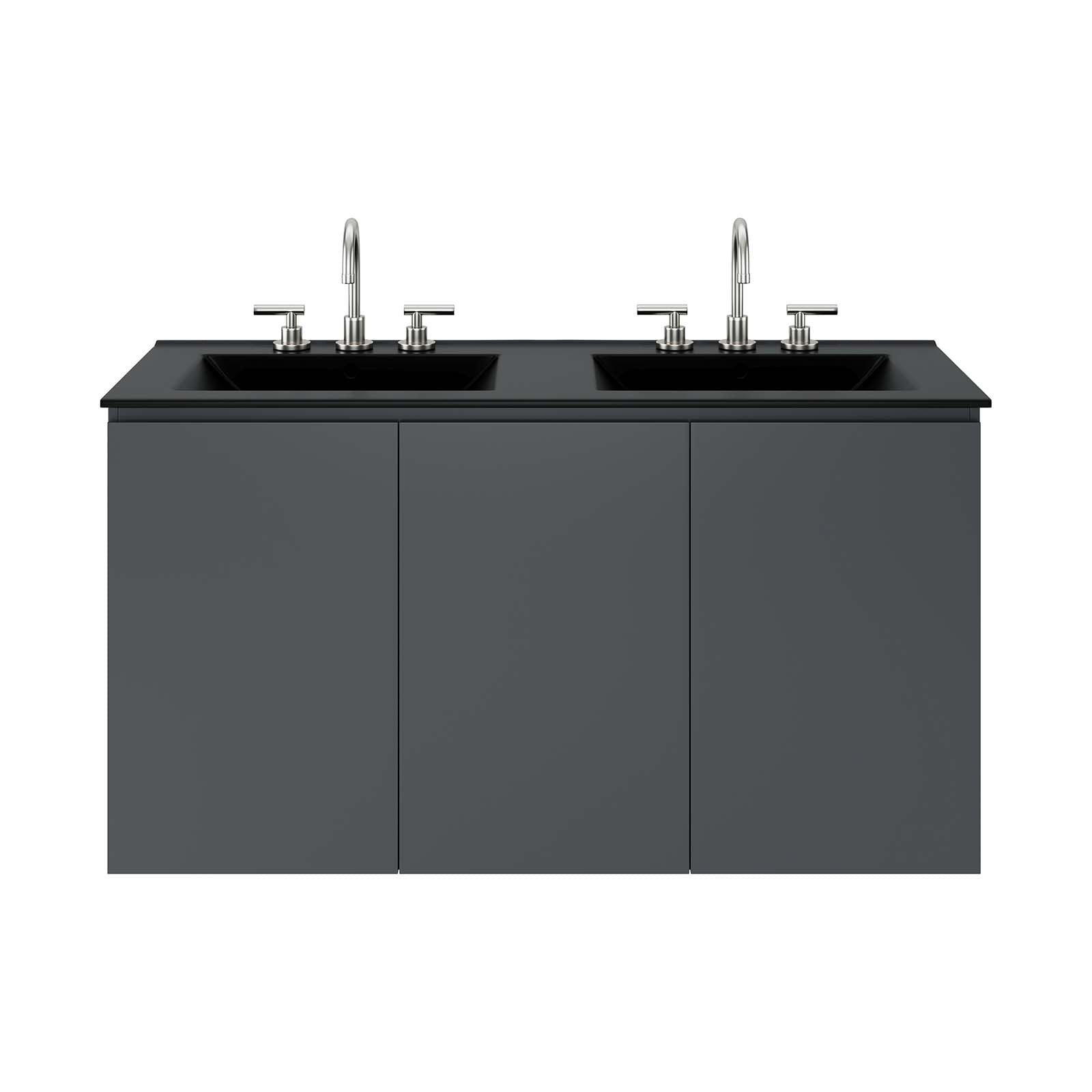 The sleek look and clean-lined silhouette of the Bryn 48" Wall-Mount Double Sink Bathroom Vanity add modern style to your bathroom space. Durably crafted with particleboard and melamine, this vanity mounts directly to the wall and features ample storage space under the sink behind three soft-close doors. Bryn features a cut-out design to accommodate plumbing. This vanity is complete with a double sink ceramic basin with 8-inch centerset holes and an integrated countertop. Fixtures not included. Assembly required. Set Includes: One - Bryn 48" Wall-Mount Double Sink Bathroom Vanity